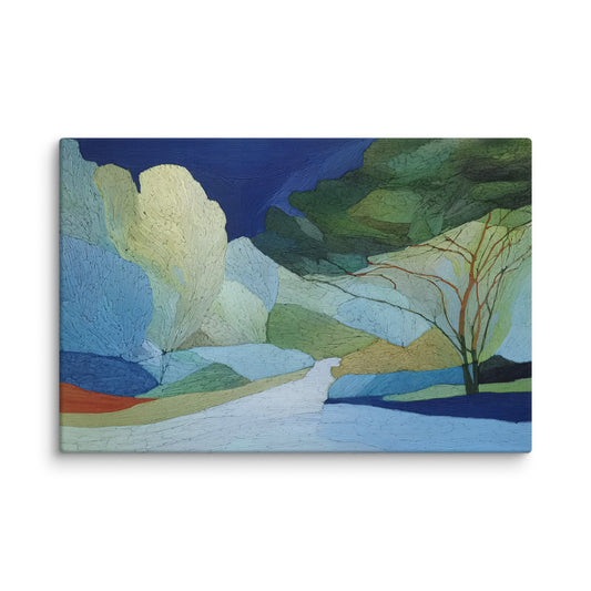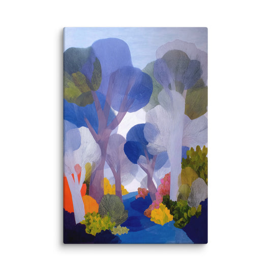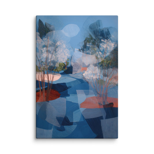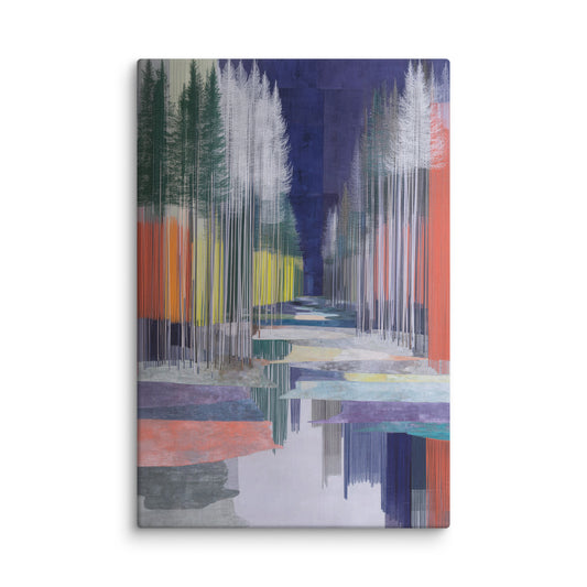 Tableau Forêt boréale évaporée – azur et corail en clair-obscur