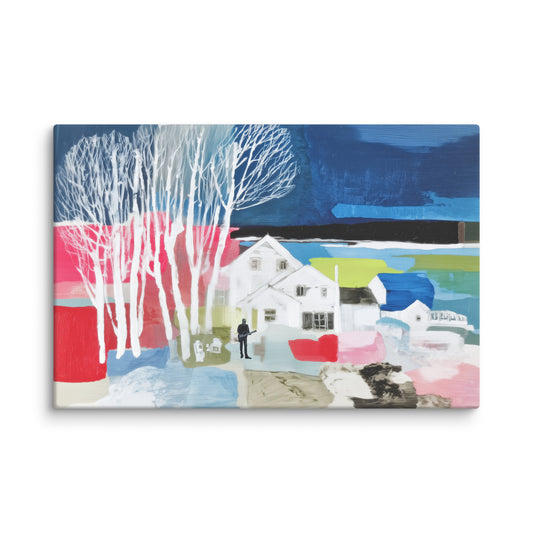 Toile Hygge électro – maison blanche aux bouleaux fluo