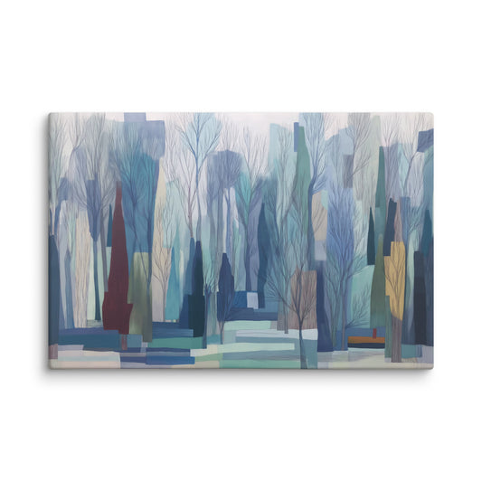 Toile Fjord boréal mosaïque – rivages cobalt et pins verticaux