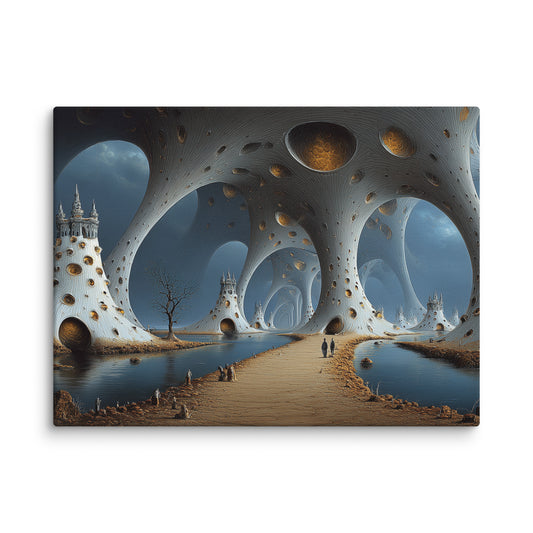 Toile art surréaliste - temple organique au milieu des dunes
