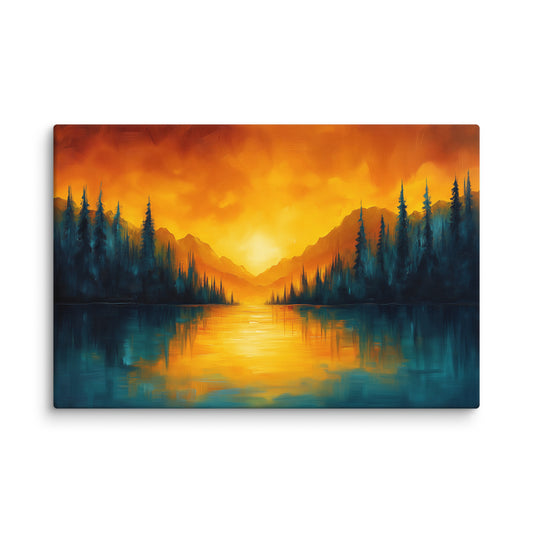 Tableau Jaune et Bleu Canard : Crépuscule sur le Lac