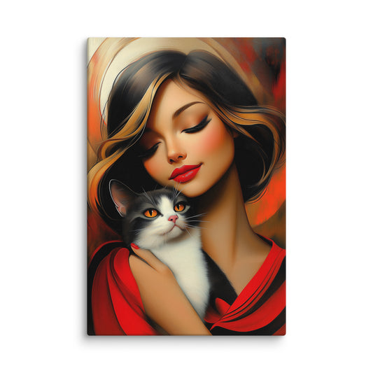⚡️ Promo ⚡️Tableau Femme avec Chat - Complicité en Rouge