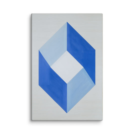 Tableau Minimaliste au Cube Géométrique en Bleu et Blanc