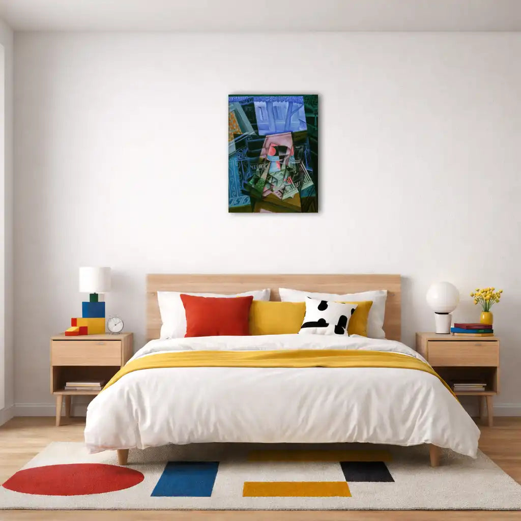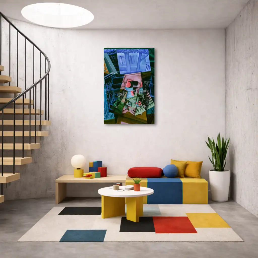 In diesem Stillleben von Juan Gris steht ein Tisch vor einem Balkon: Gläser, Flasche, Zeitung und Karten fügen sich in einer kubistischen Komposition zusammen, in der nächtliche Blautöne auf pudrige Rosas treffen. Dahinter enthüllt das offene Fenster Fassaden und Jalousien, wie ein geometrisches Echo der Gegenstände. Dieses vertikale Wandbild lässt die Stadtluft in die Intimität des Ateliers einströmen und bietet der Wand einen aus Flächen, Winkeln und Transparenzen gebauten Horizont.