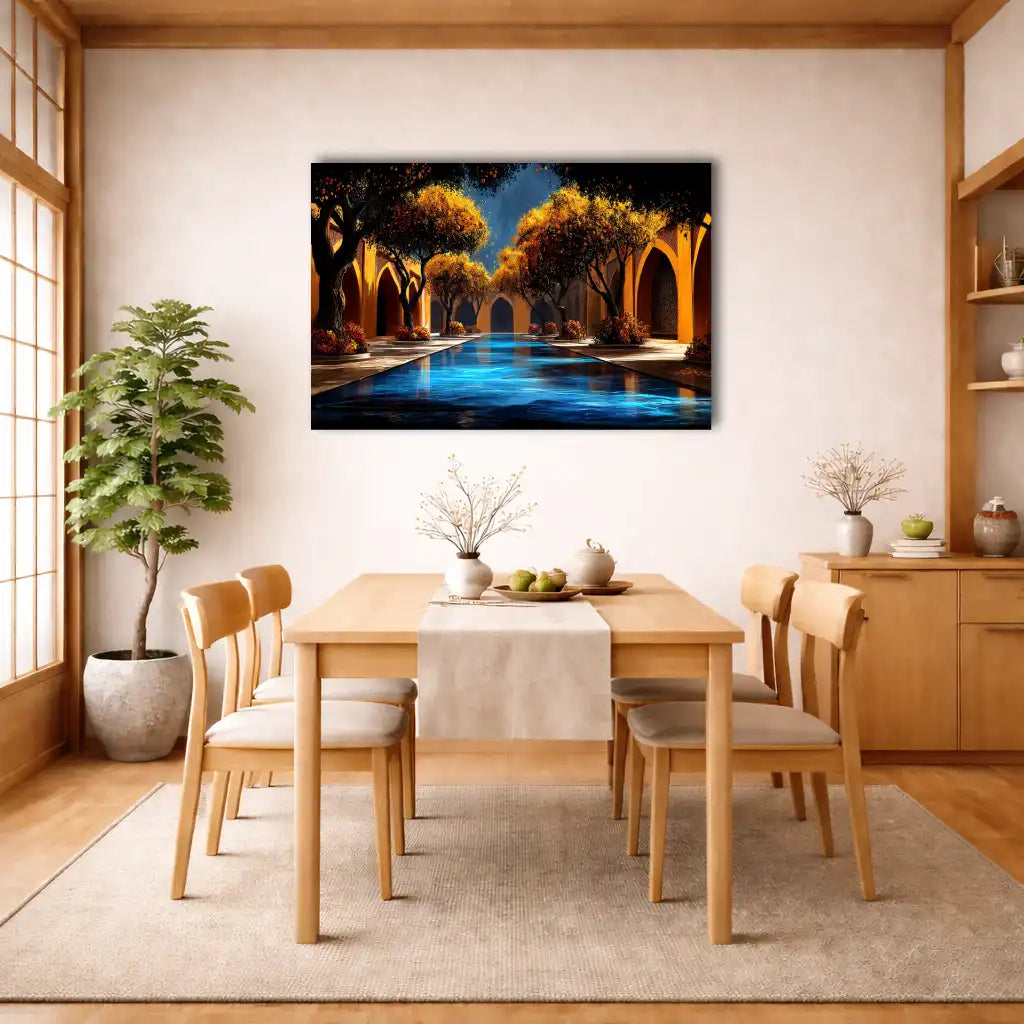 Diese horizontale Leinwand evoziert einen von Ocker durchfluteten Riad: maurische Arkaden säumen ein tiefblaues Wasserbecken, in dem sich das Licht spiegelt. Die Orangenbäume, schwer von Früchten, rhythmisieren den Weg, während karminfarbenes Laub die Szene gliedert. „Afrikanische Dekorationsleinwand" verbreitet einen Hauch afrikanischer Kunst, inspiriert vom Maghreb, ideal für eine Wanddekoration, die zur Gelassenheit einlädt.