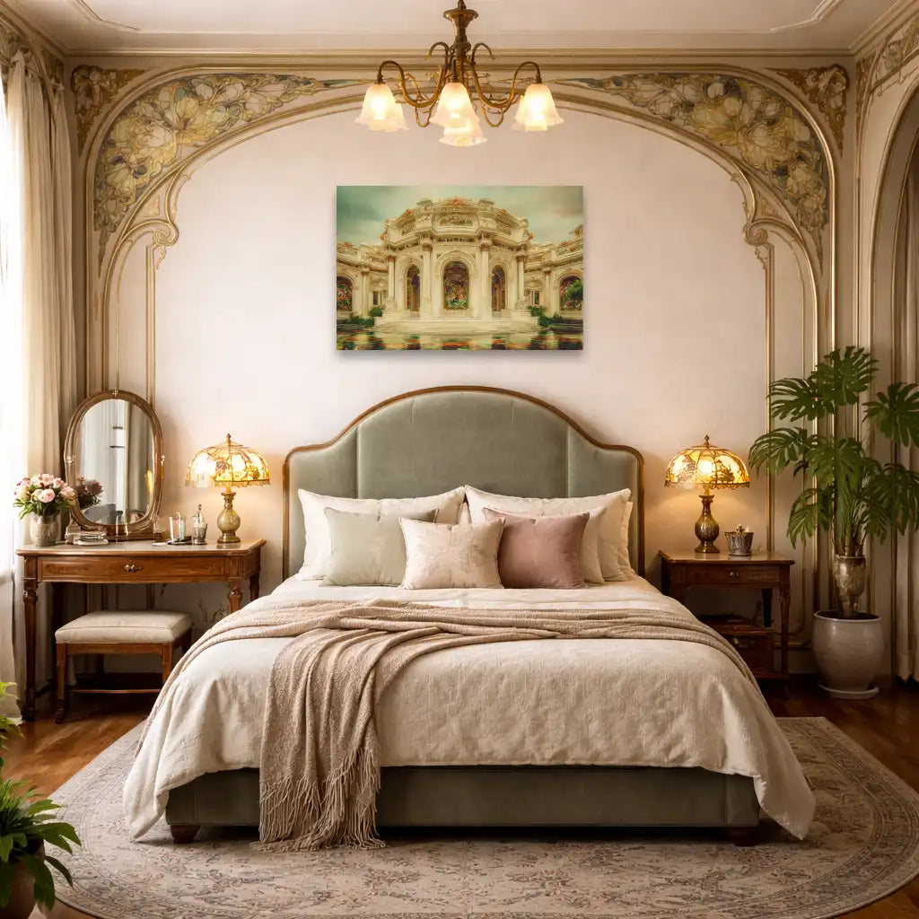 In dieser horizontalen Leinwand erhebt sich ein Belle-Époque-Pavillon wie ein Opernbühnendekor. Die elfenbeinfarbenen Arkaden, die gerippten Säulen und die skulptierten Kartuschen beherbergen Blumenfresken in tiefen Grüntönen. Der glänzende Boden spiegelt die Fassade wie ein Marmorspiegel wider, während die Vergoldungen jedes Gesims betonen. „Leinwand Belle-Époque-Pavillon" beschwört die Eleganz der Beaux-Arts und den dekorativen Schwung des Jugendstils für eine majestätische Wanddekoration.