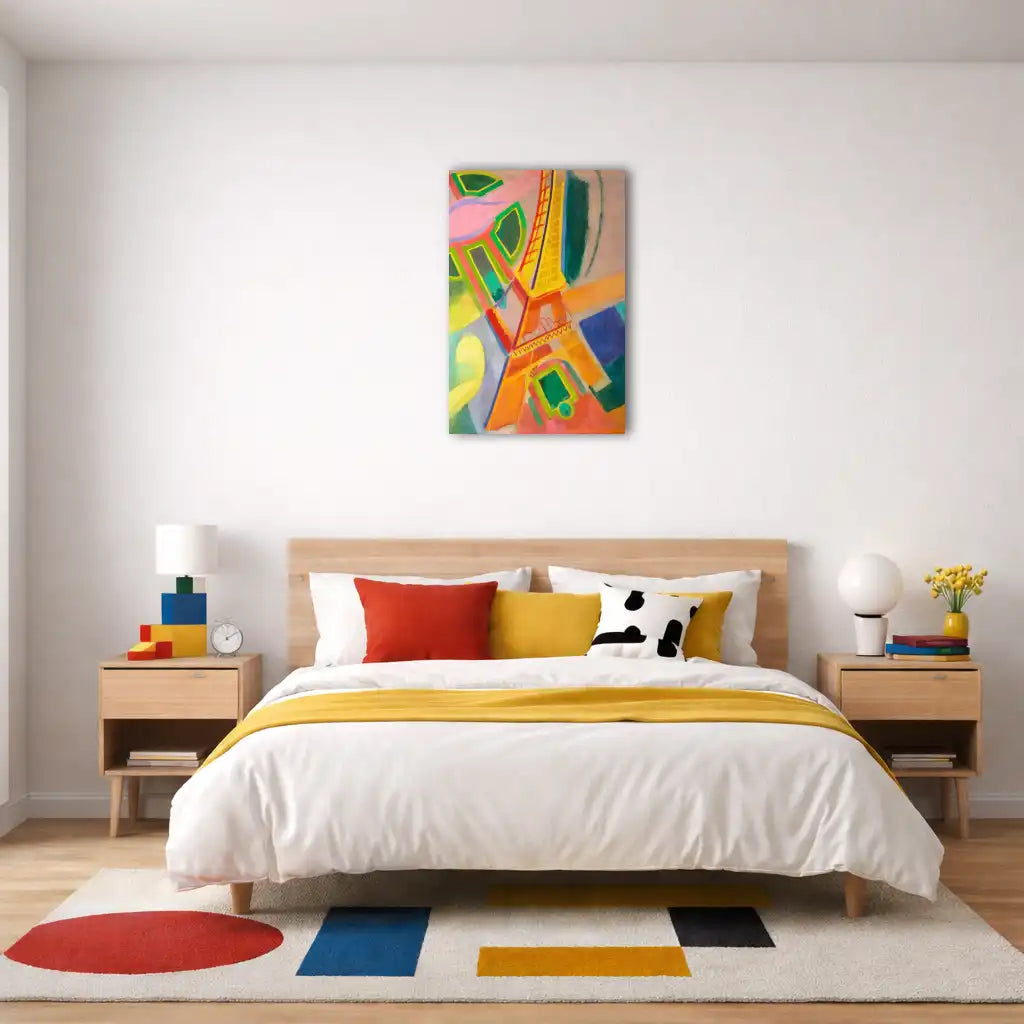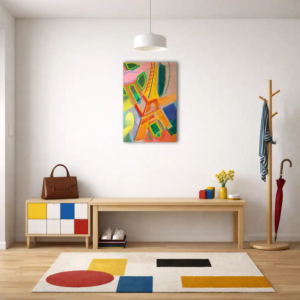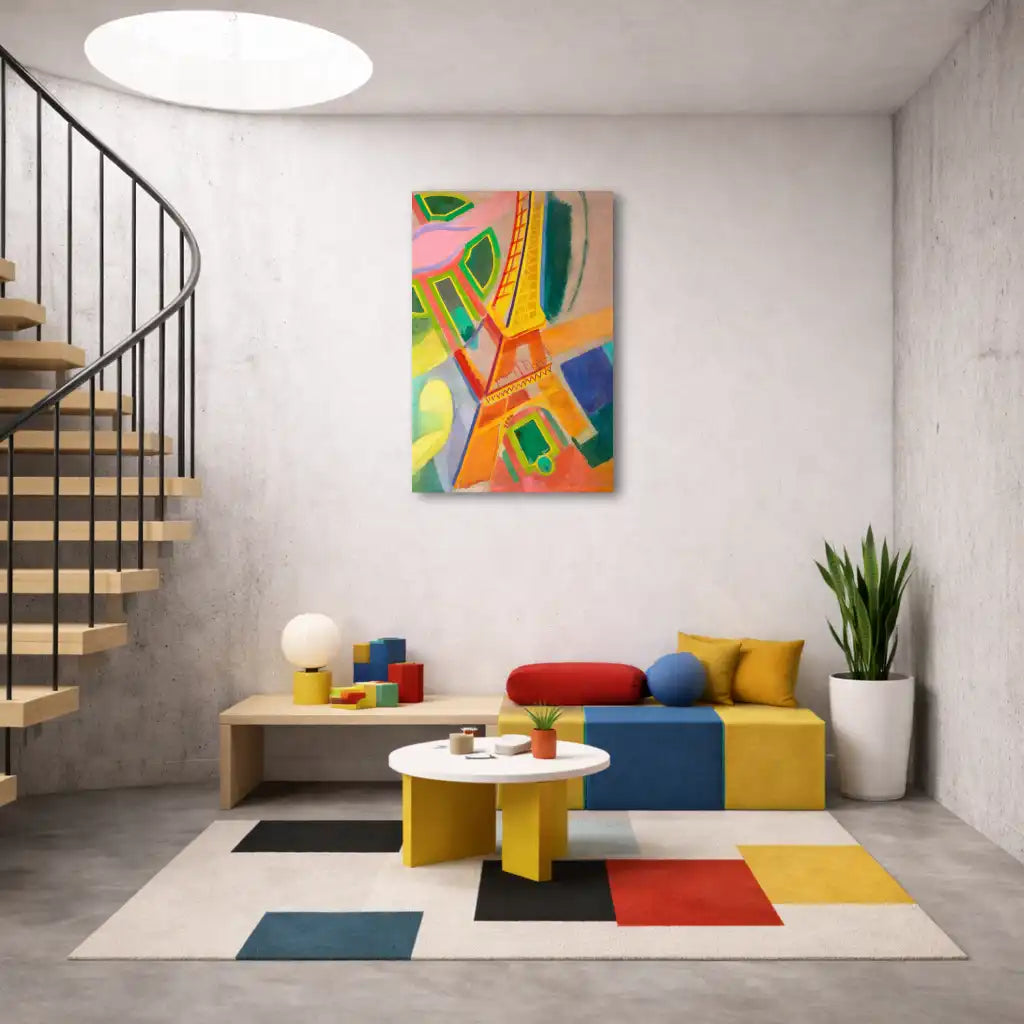 Our abstract Eiffel Tower wall art celebrates the iconic 1924 work by Robert Delaunay — a true manifesto of Orphism. This canvas print captures the Iron Lady in an explosion of pure color: candy pink, emerald green, brilliant yellow, luminous orange, and deep blue intertwine in a bold geometric composition. The tower's metal structure fragments into superimposed colored planes, creating dynamic wall art where Parisian architecture becomes the pretext for a celebration of color and movement. Angular forms and organic curves dialogue in this Modernist vision that transcends simple representation.
