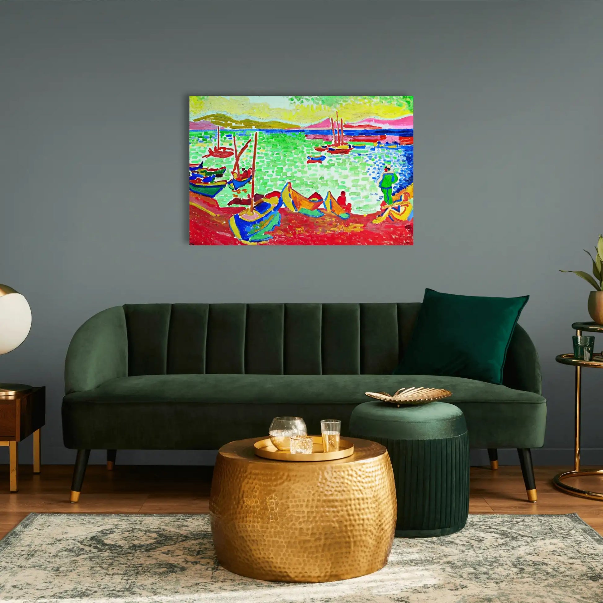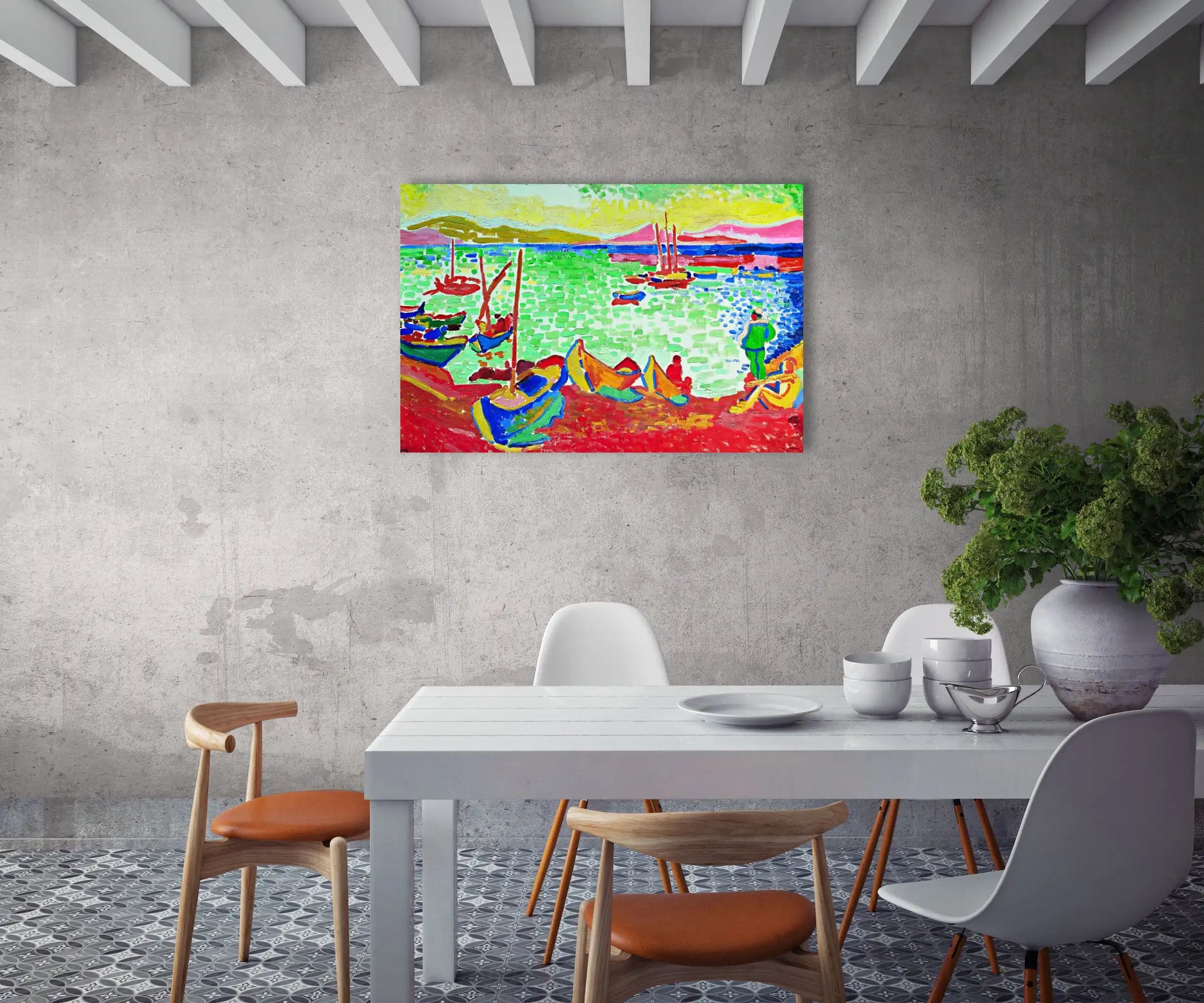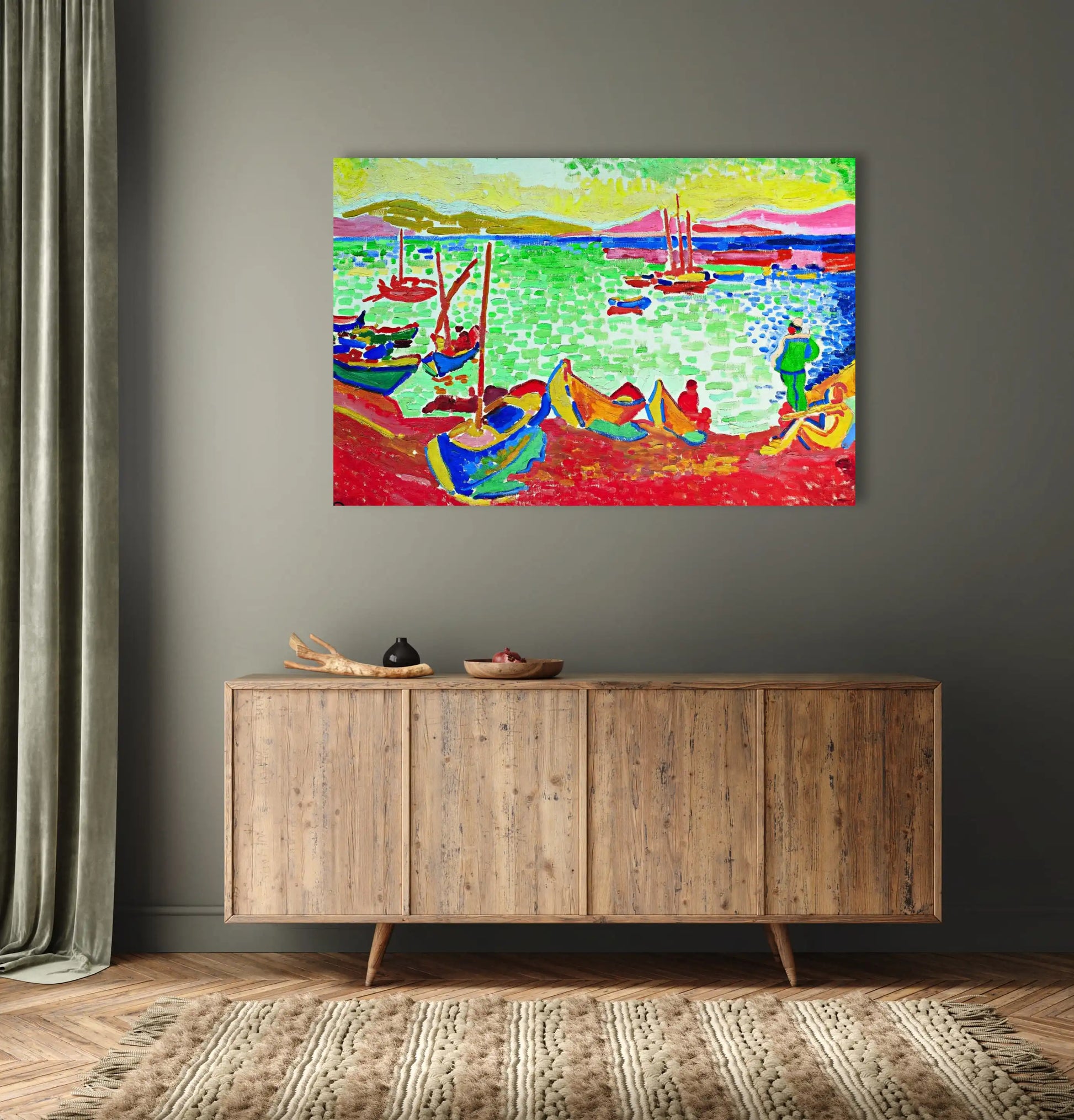 Cette peinture fauve illustre parfaitement la rupture esthétique de Collioure : l'abandon définitif de la couleur imitative. L'impression sur toile haute définition révèle l'audace de ces empâtements généreux où chaque coup de pinceau affirme sa présence. L'eau n'est plus bleue mais verte acide, le sable devient rouge carmin, les voiles se transforment en éclats multicolores. Cette technique spontanée, héritée de Van Gogh mais amplifiée par l'esprit méditerranéen, crée une décoration murale d'une joie communicative qui embrase instantanément l'espace.