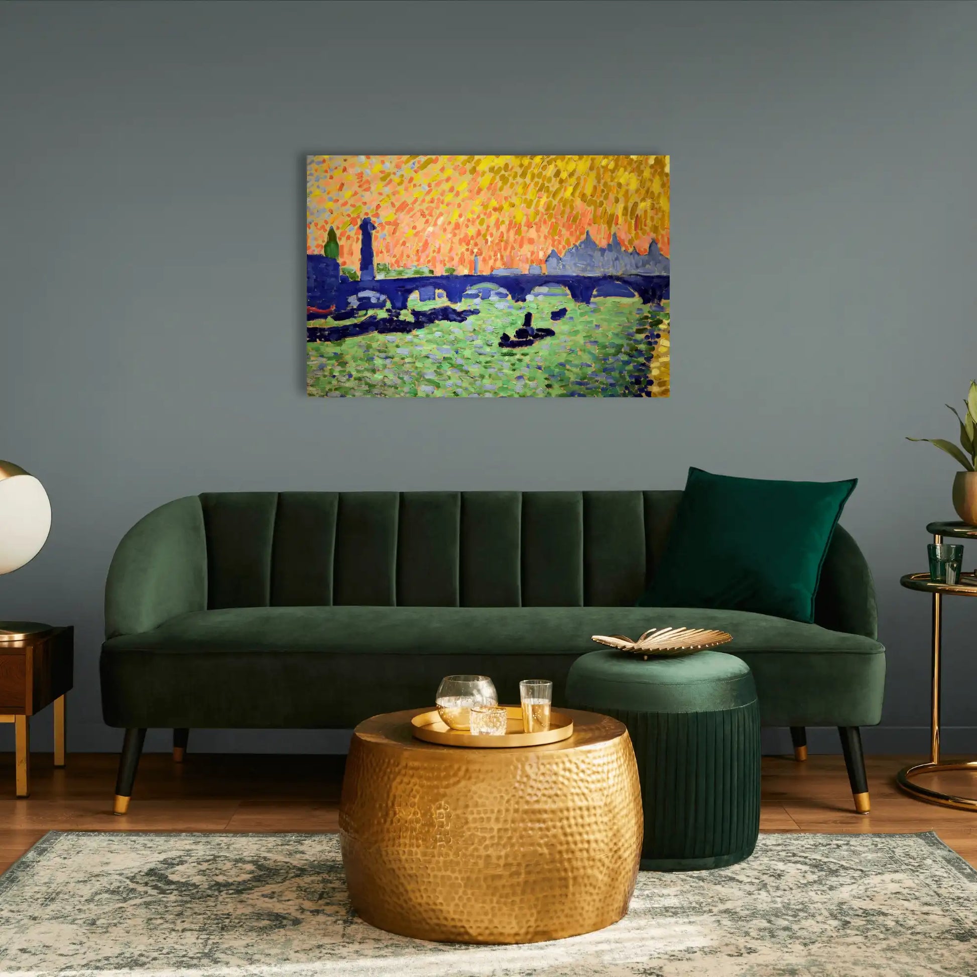 Cette peinture fauve illustre parfaitement la rupture artistique de 1906, quand Derain révolutionne la représentation de Londres. L'impression sur toile haute définition restitue fidèlement l'audace de ces couleurs arbitraires : le pont n'est plus gris mais d'un bleu profond, le ciel flamboie d'ocres et de vermillons, l'eau se pare de verts acides. Cette technique divisionniste, héritée du pointillisme mais amplifiée par la spontanéité fauve, crée une décoration murale d'une modernité absolue qui dialogue avec l'impressionnisme de Monet tout en s'en affranchissant.