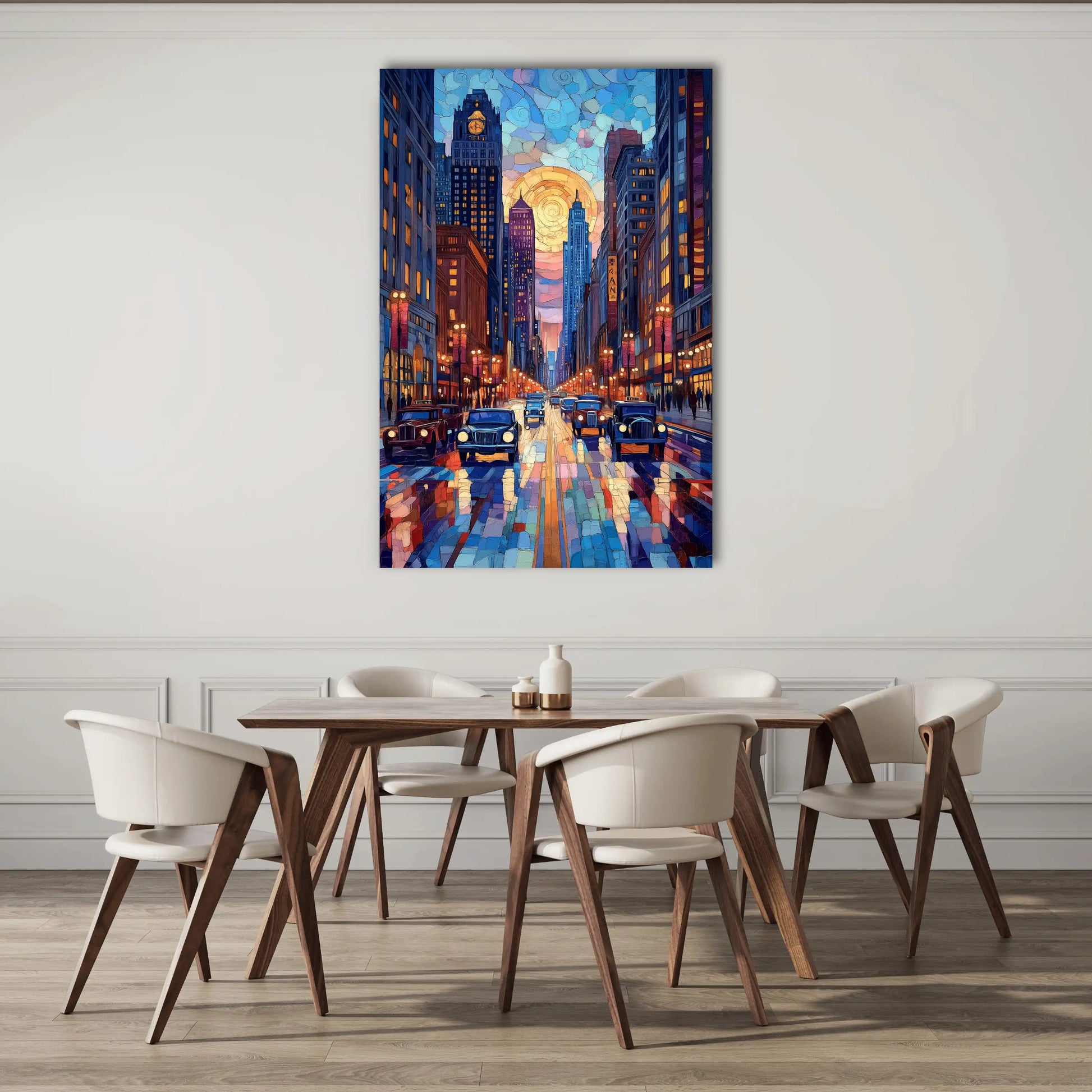 Ce tableau mural réinterprète l'esthétique art déco avec une sensibilité contemporaine. Chaque détail architectural des gratte-ciels, chaque reflet sur les carrosseries lustrées, chaque éclat de lumière des réverbères a été rendu avec une précision remarquable. Les couleurs vibrantes et la composition dynamique font de cette œuvre d'art une pièce maîtresse pour votre intérieur, captant l'énergie et le glamour de l'âge d'or des métropoles américaines.