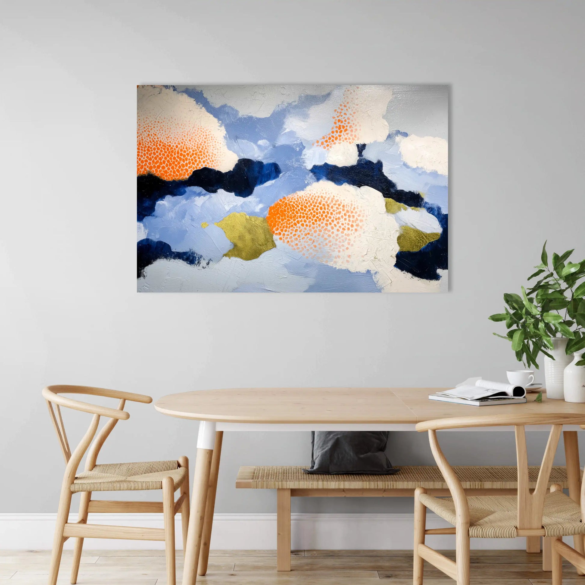 Telle une aurore inversée, cette toile contemporaine superpose de larges nappes d’indigo profond, de blancs opalins et d’esquilles corail qui scintillent comme une myriade de petites lucioles arctiques. Les touches pointillistes, délicatement orangées, percent la masse nuageuse, offrant un jeu de lumière qui rappelle le crépitement des glaces sous un soleil d’été nordique. La texture épaisse, presque minérale, crée du relief, invitant l’œil à vagabonder entre douceur cotonneuse et souffle océanique.