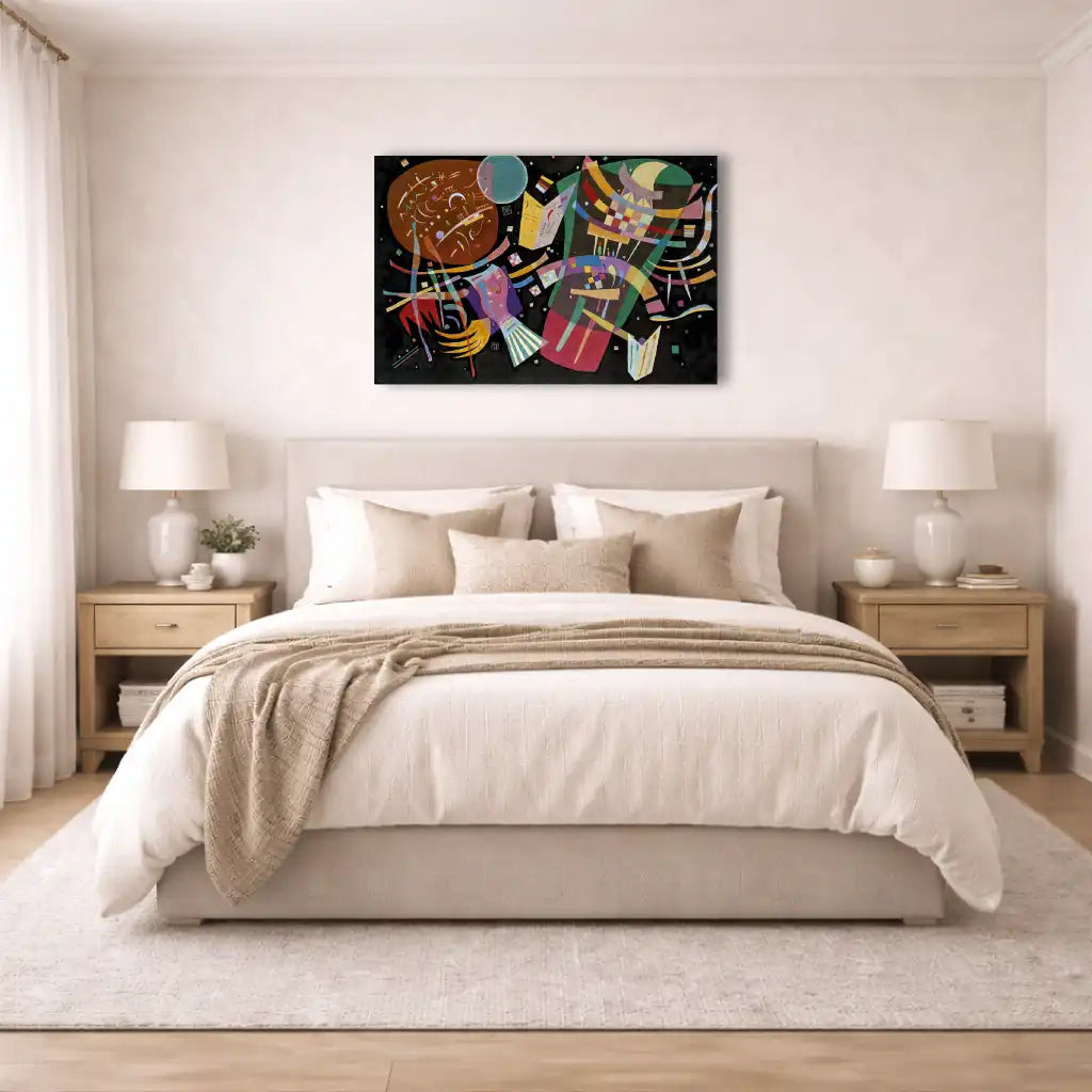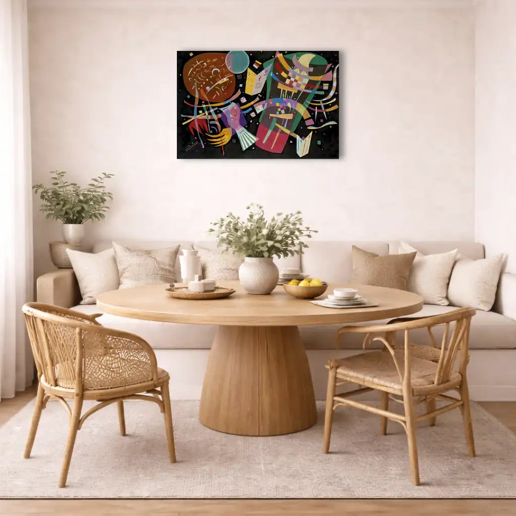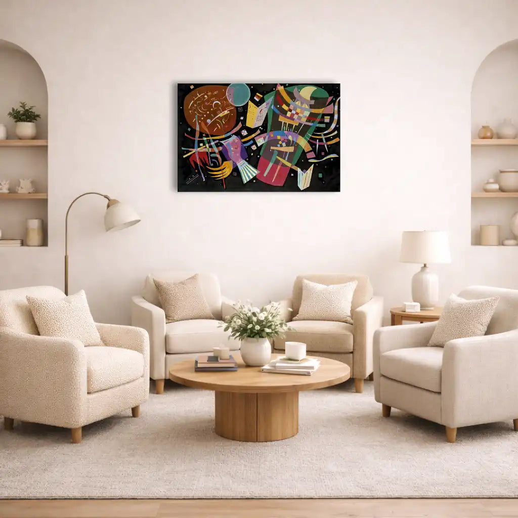 La richesse chromatique de cette reproduction sur toile attire le regard tout en conservant une grande harmonie visuelle. Chaque forme semble animée d’une intention propre, conférant à l’ensemble une dimension presque spirituelle, signature de l’art abstrait de Kandinsky.