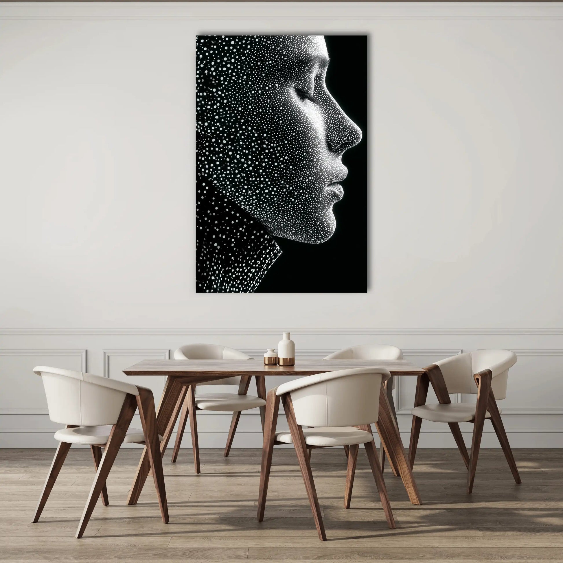 Cette toile imprimée se distingue par sa technique pointilliste moderne qui évoque les constellations célestes. Chaque point blanc est placé avec une précision mathématique pour créer gradients et textures, formant les contours délicats des lèvres, du nez et des yeux. La densité variable des points génère une profondeur saisissante, comme si le visage émergeait du néant ou s'y dissolvait. Une impression sur toile qui joue avec la perception, invitant le regard à osciller entre la vision d'ensemble et l'observation des détails infinis qui composent ce portrait moderne.