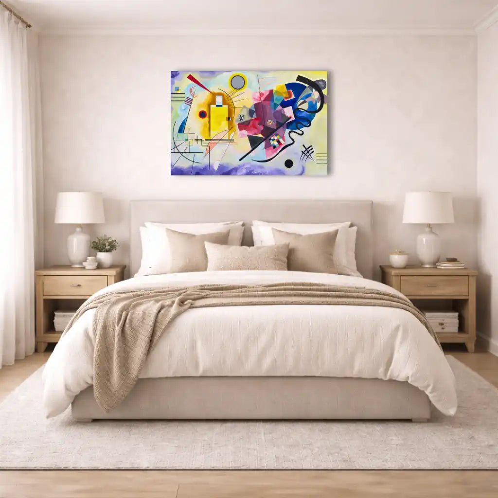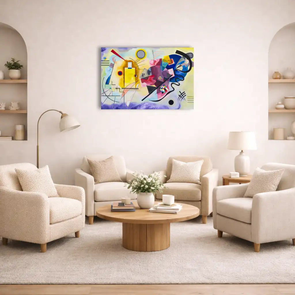 Choisir Jaune Rouge Bleu - Kandinsky, c’est intégrer à votre décoration une œuvre emblématique de l’art abstrait, où couleurs primaires et formes géométriques s’unissent dans une orchestration visuelle d’une rare élégance.