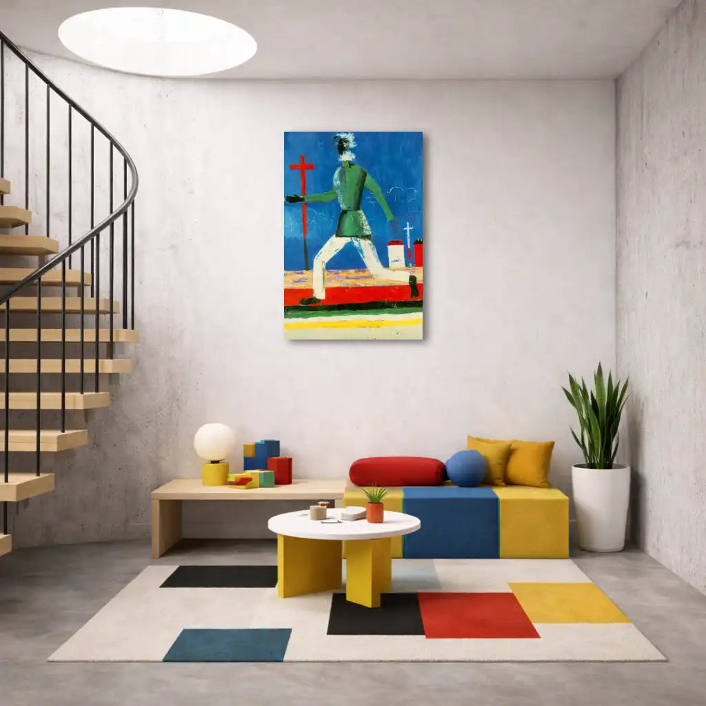 Ce tableau abstrait incarne parfaitement la philosophie de Malevitch : réduire la représentation à ses composantes essentielles tout en préservant l'émotion et le dynamisme. La posture de l'homme en mouvement, bras écartés dans une gestuelle presque christique, dialogue avec la croix monumentale pour créer une tension narrative fascinante. Les formes simplifiées et les aplats de couleur transforment cette scène en une méditation visuelle sur la condition humaine et la spiritualité. Idéale pour un intérieur contemporain, cette toile abstraite apporte une touche d'histoire de l'art et de sophistication à votre décoration d'intérieur. La composition verticale guide naturellement le regard vers le ciel, créant une sensation d'élévation.