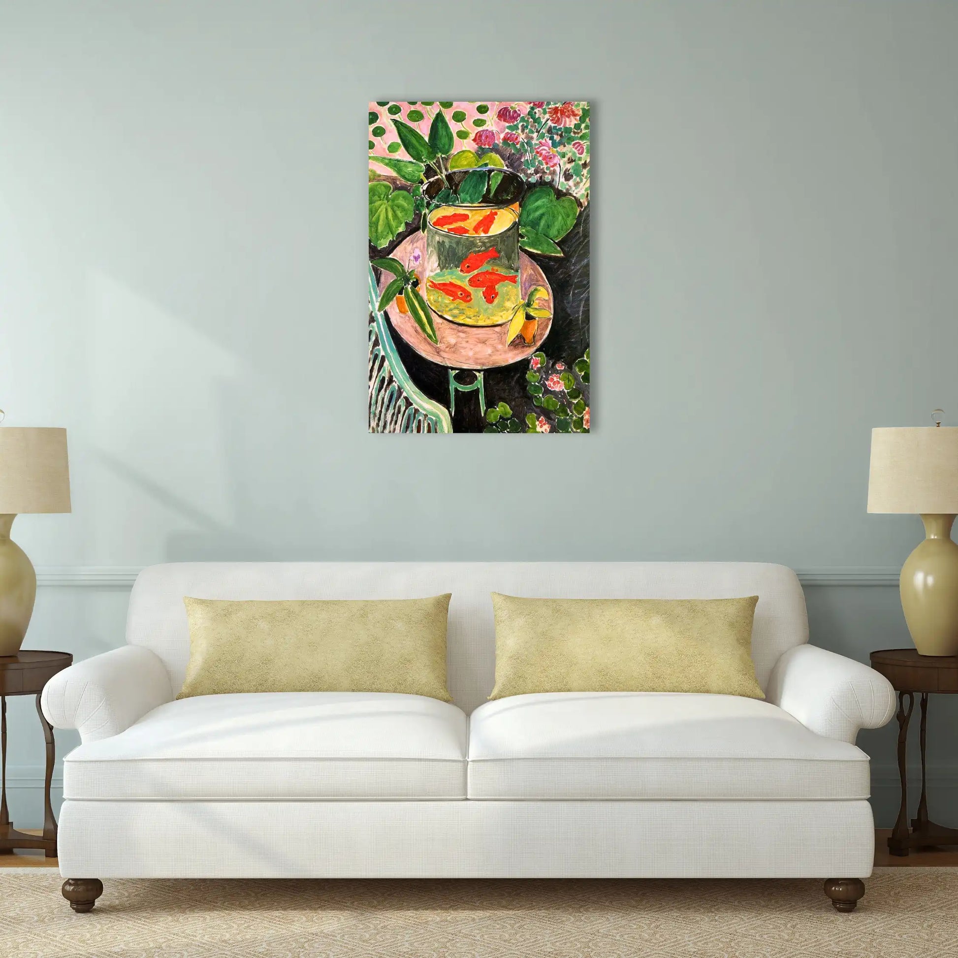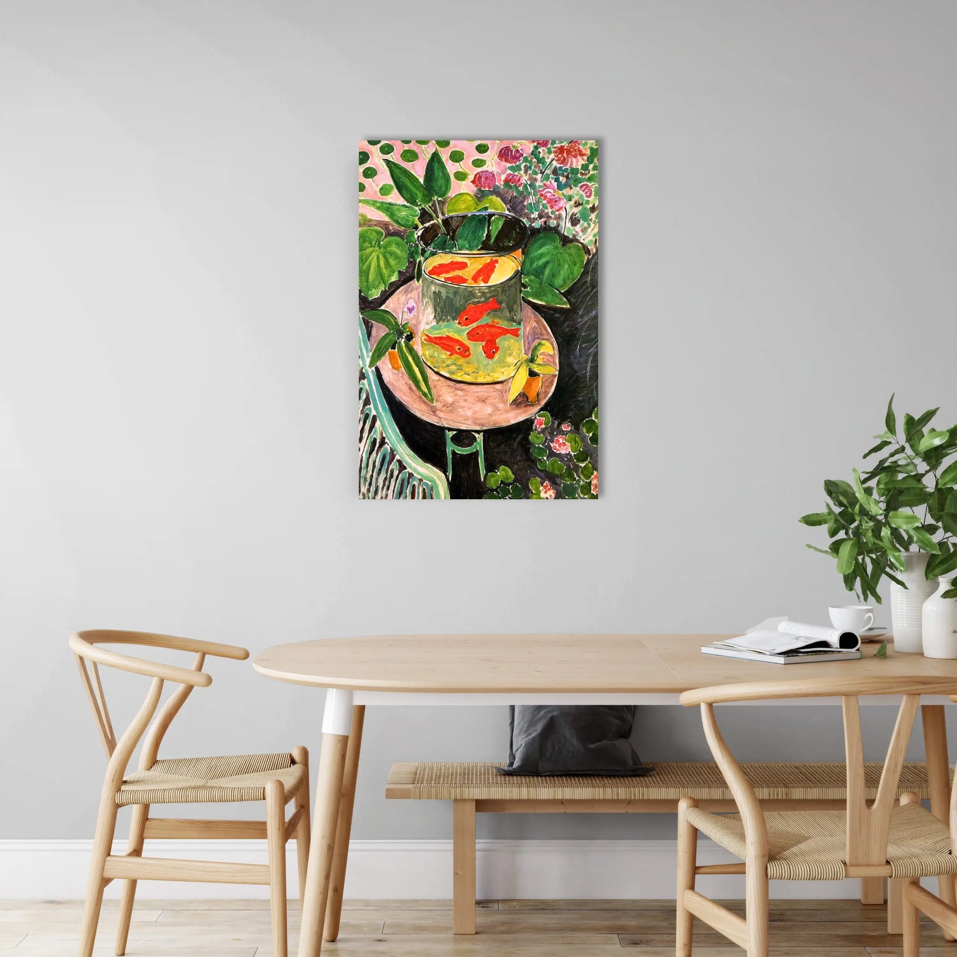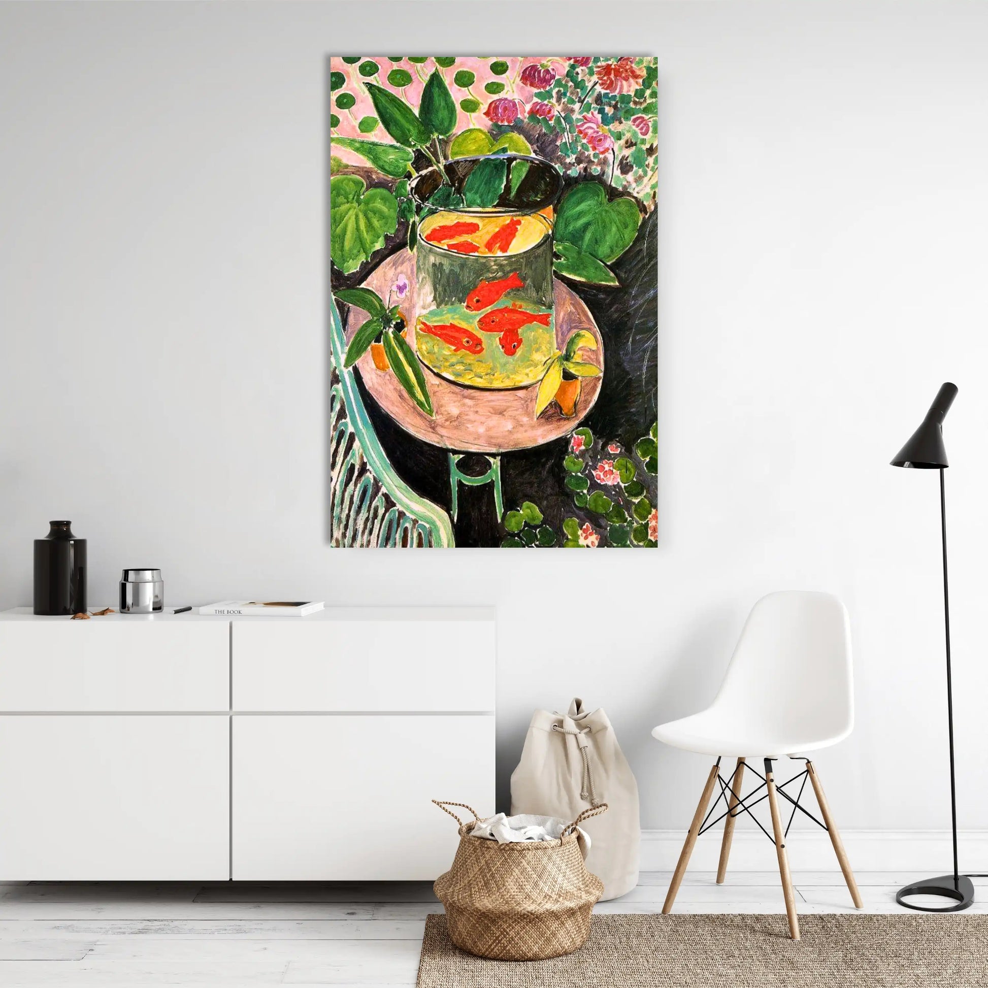 Cette œuvre d'art moderne illustre parfaitement la révolution chromatique de Matisse. L'impression sur toile haute définition restitue la subtilité des contrastes entre les rouges flamboyants des poissons, l'émeraude profonde du feuillage et la douceur des tons rosés de l'arrière-plan. La technique fauve libère chaque couleur de son rôle descriptif pour en faire un instrument d'émotion pure. Le bocal transparent, tour de force technique, révèle la maîtrise de Matisse dans le rendu des reflets et des transparences, créant une profondeur fascinante au cœur de cette composition florale.