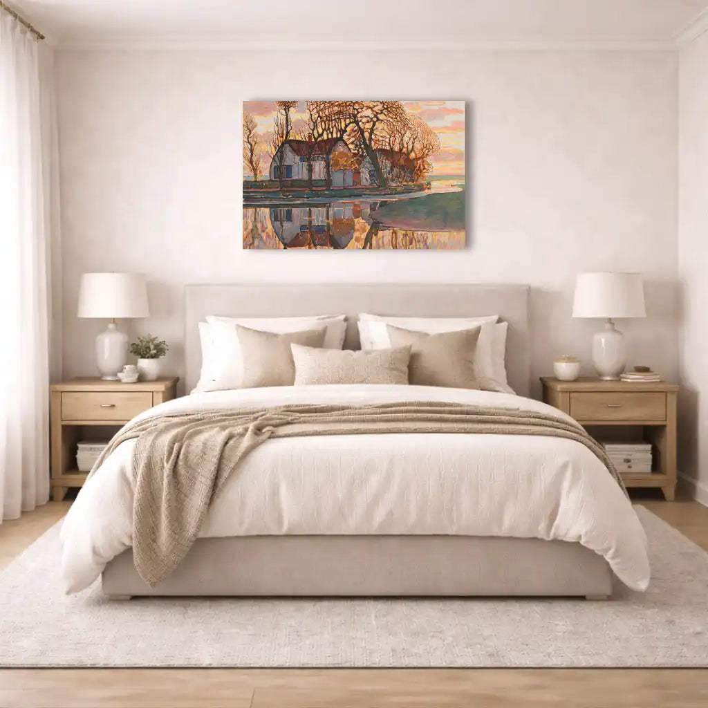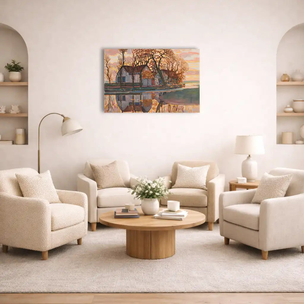 Les reflets dans l'eau tranquille accentuent la symétrie naturelle et la beauté du moment, tandis que les arbres dénudés se dressent comme des sentinelles silencieuses. Ce tableau évoque un sentiment de paix et d'intemporalité, caractéristique des premières œuvres de Mondrian.