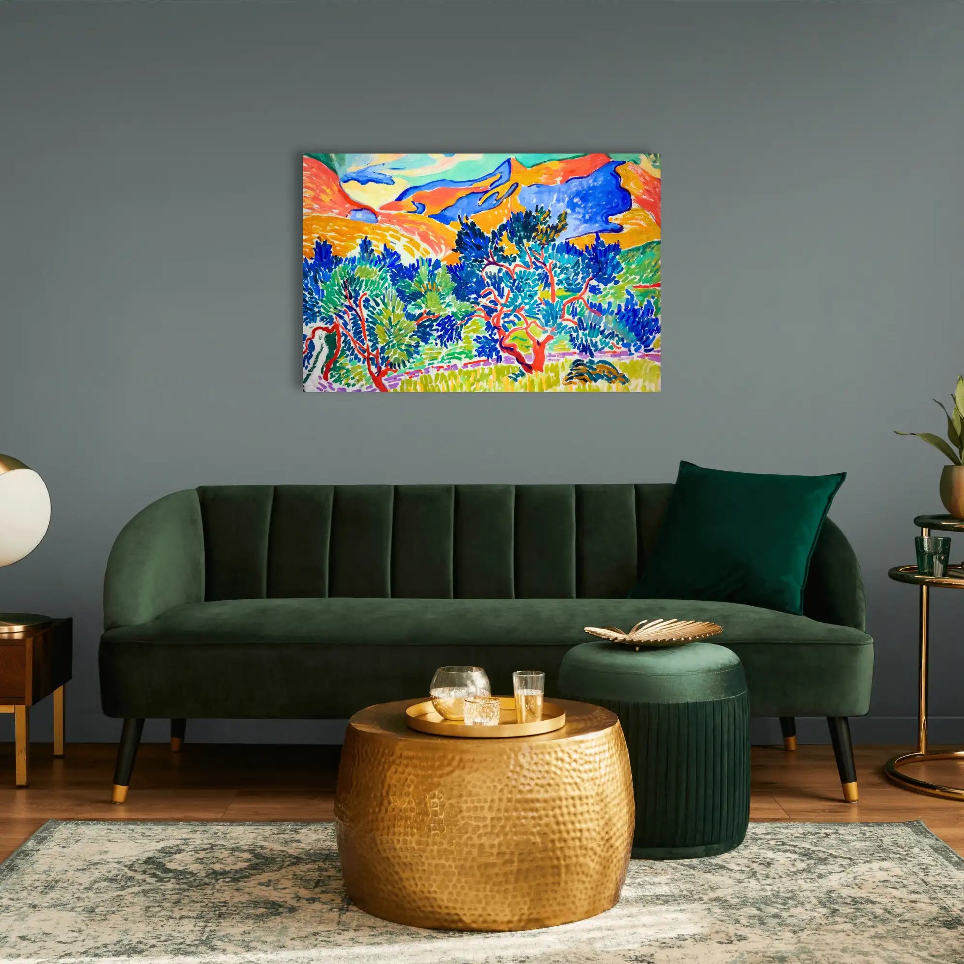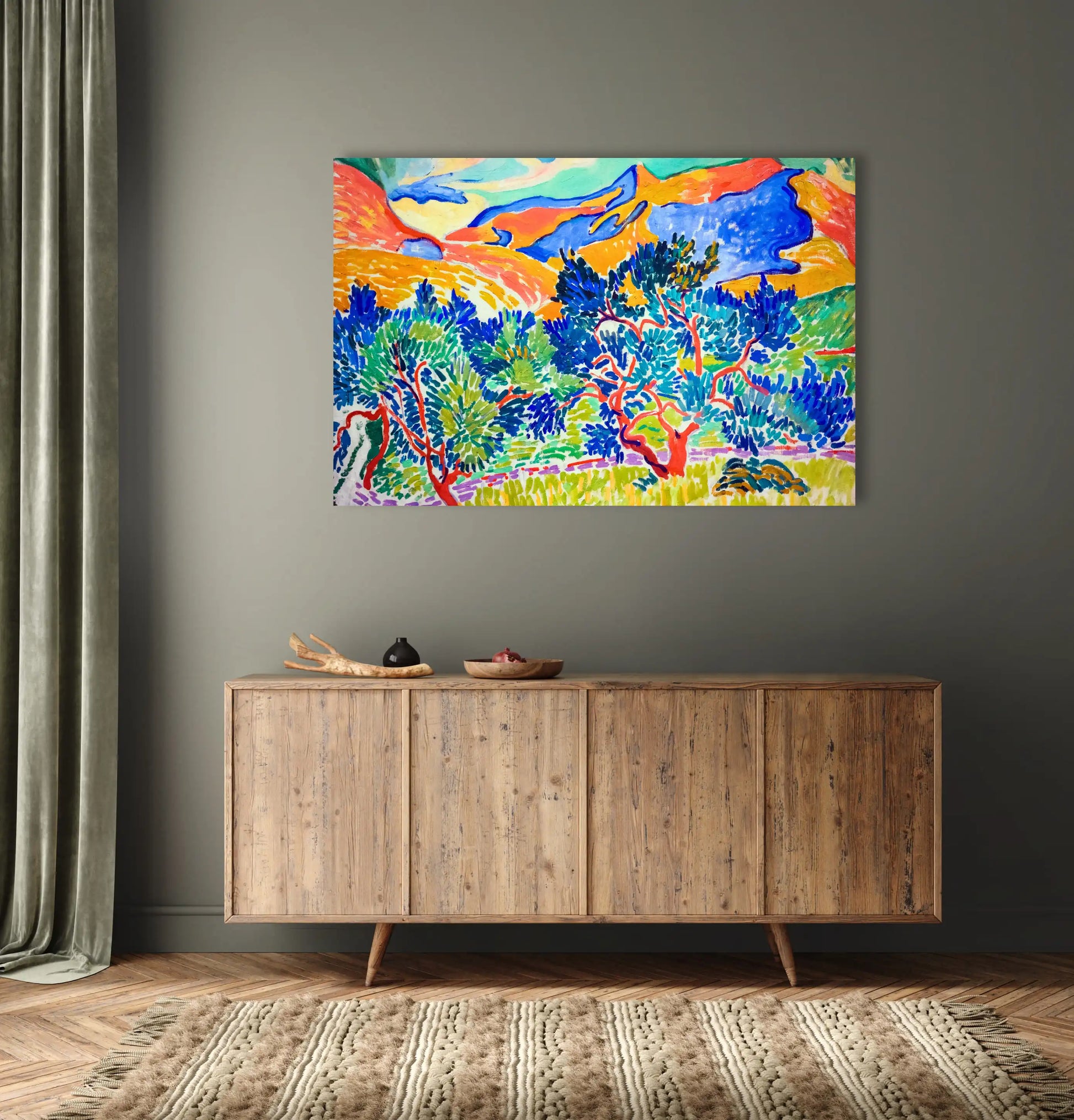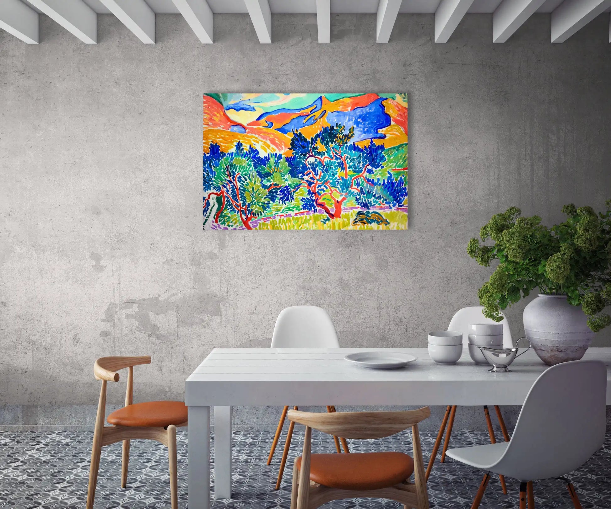 Cette peinture fauve pousse à l'extrême la révolution chromatique initiée dans le port de Collioure. L'impression sur toile haute définition révèle l'audace de cette palette arbitraire où chaque élément naturel devient prétexte à explosion coloriste. Les troncs ne sont plus bruns mais rouge carmin, le feuillage abandonne le vert pour le bleu prussien, les roches se transforment en coulées d'or et d'orange. Cette technique divisionniste exacerbée, héritée de Cézanne mais libérée de toute contrainte imitative, crée une décoration murale d'une intensité émotionnelle remarquable.