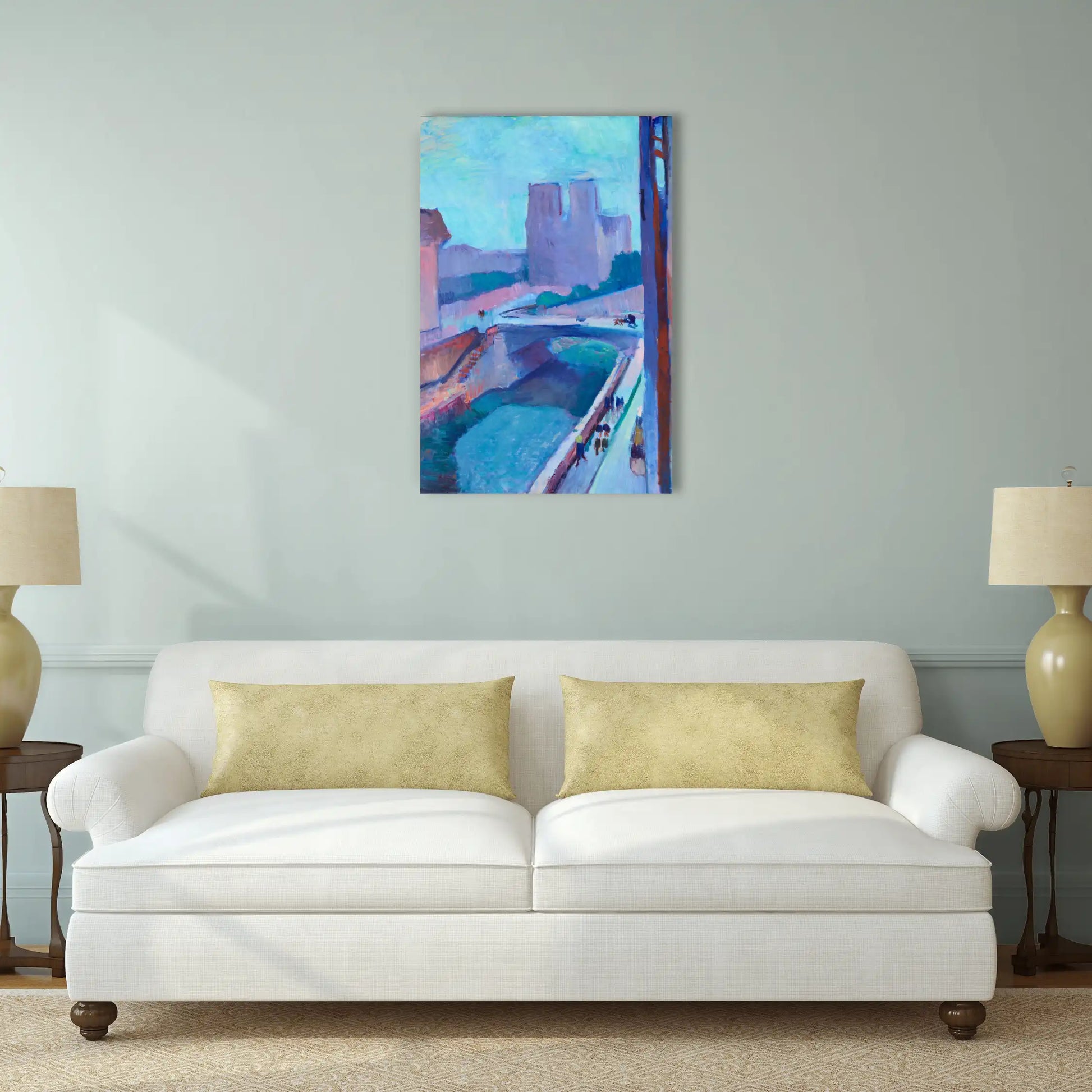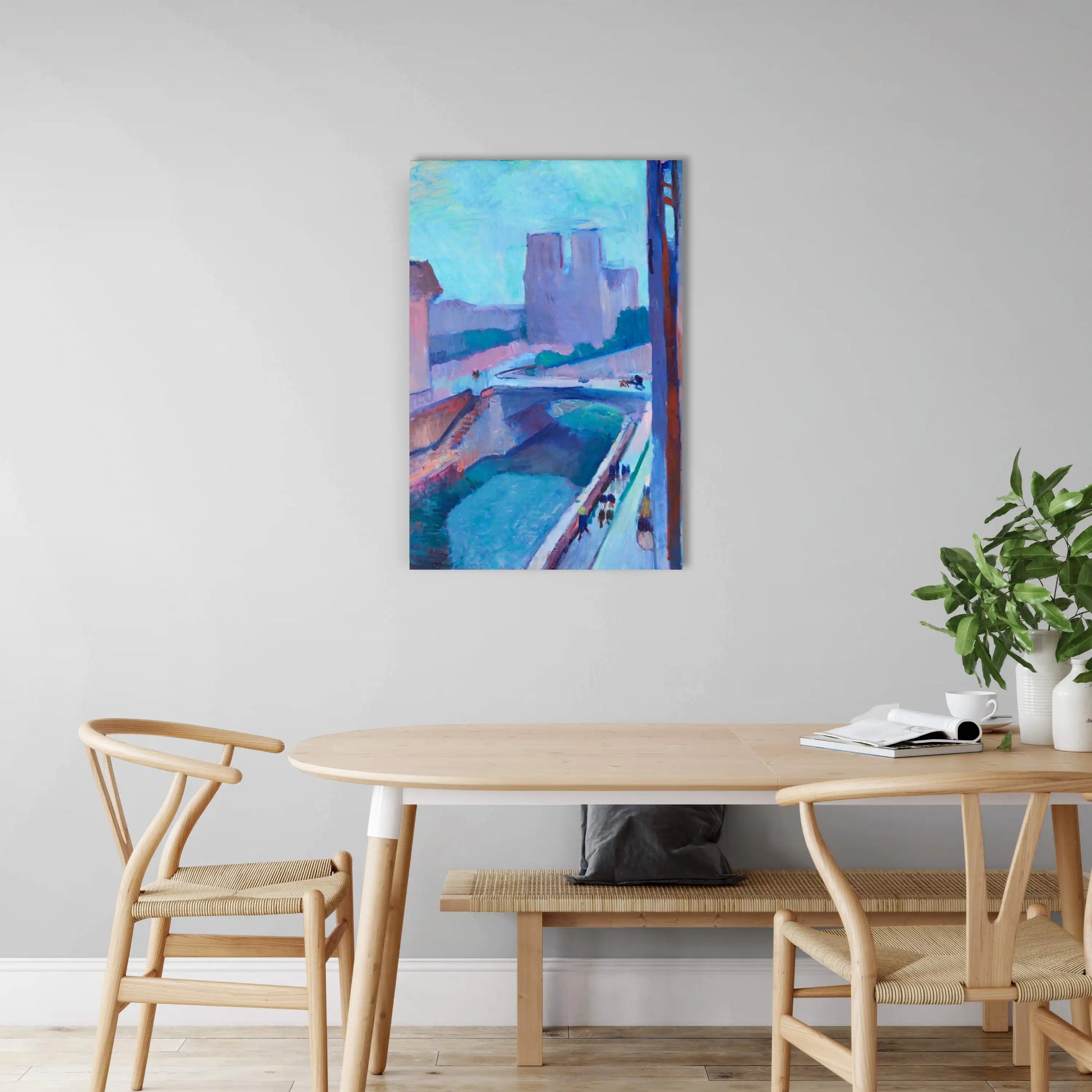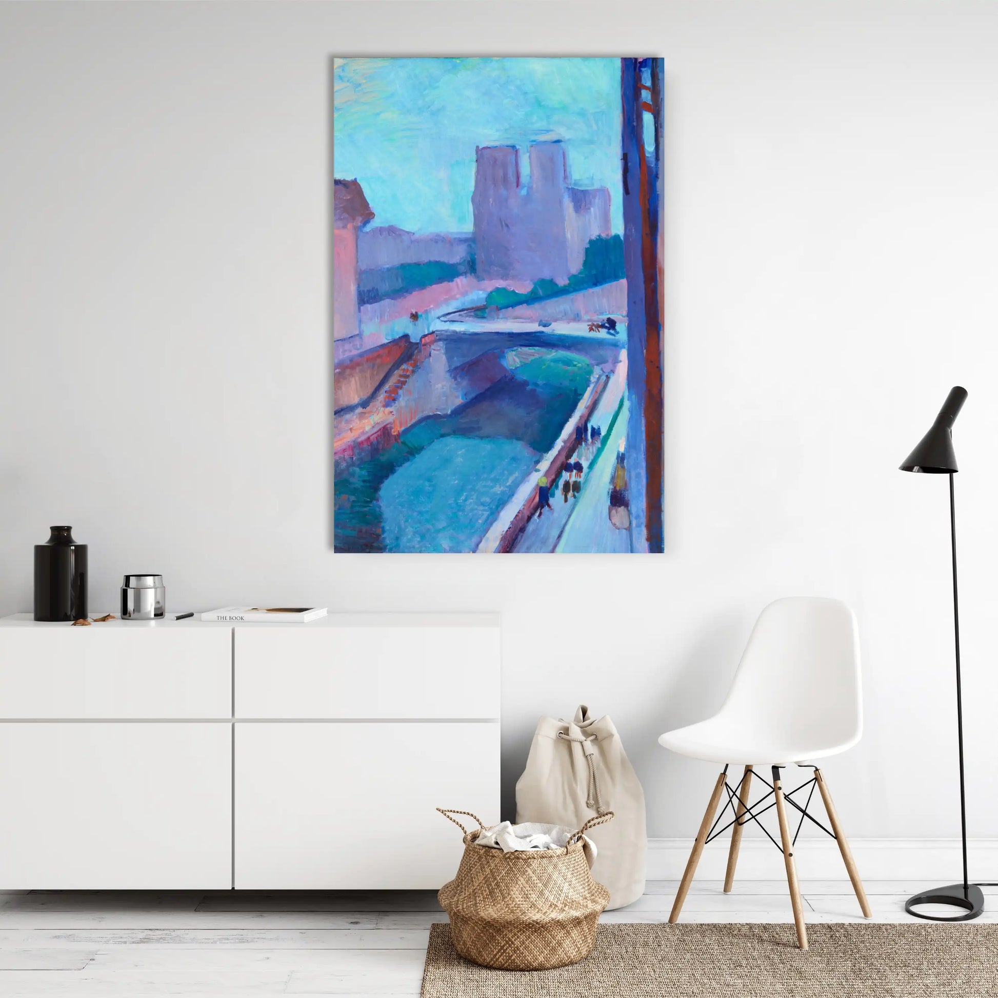 Cette œuvre d'art moderne illustre parfaitement l'évolution de Matisse vers une liberté chromatique totale. L'impression sur toile haute définition restitue la subtilité des bleus profonds qui baignent la Seine, contrastant avec les violets poudrés de l'architecture gothique et les touches orangées qui réchauffent la composition. La technique fauve libère chaque couleur de son rôle descriptif pour créer une atmosphère onirique où réalisme et expressivité fusionnent. Le cadrage depuis la fenêtre, avec ses montants verticaux, crée un effet de théâtralité qui transforme Paris en décor d'opéra coloré.