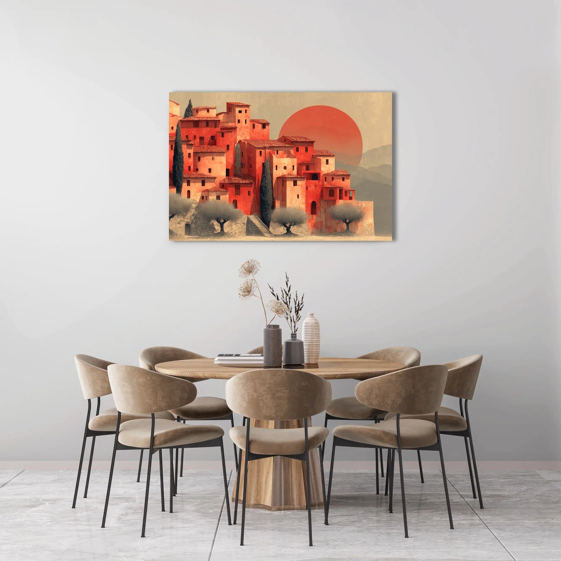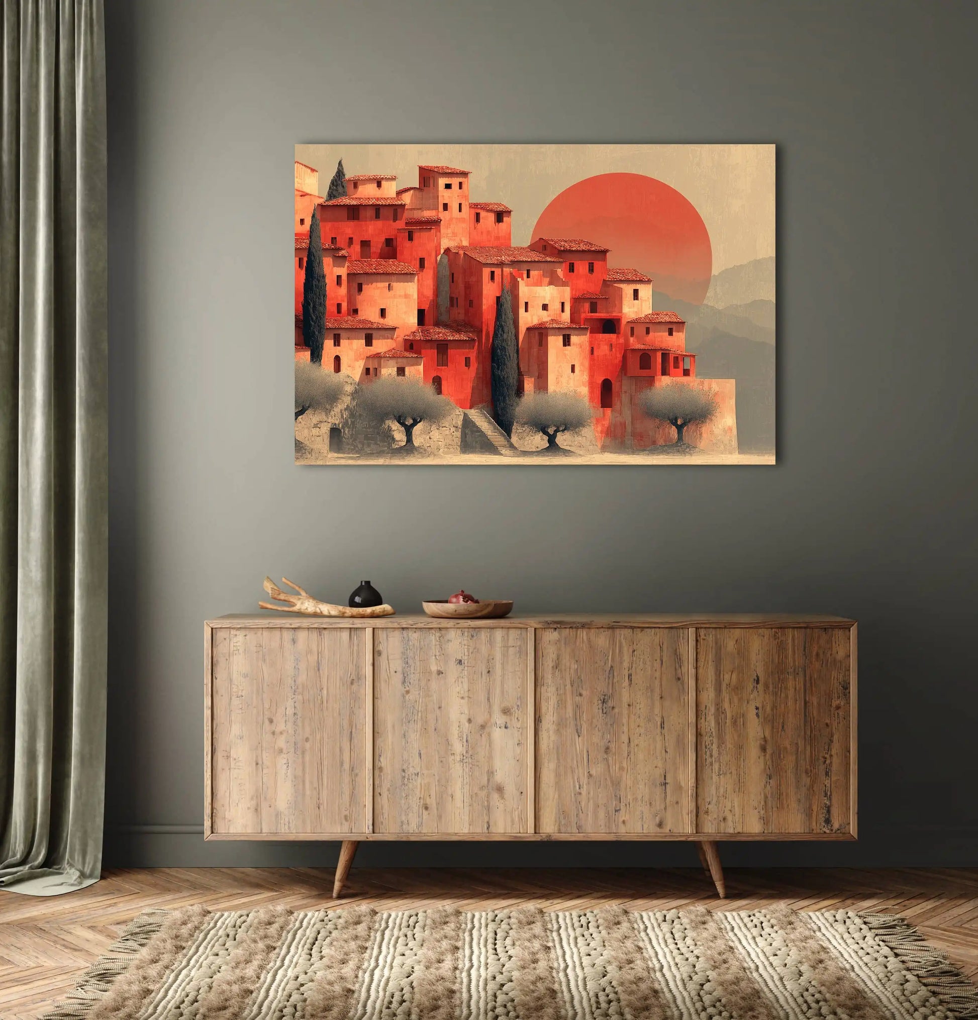 La Peinture Méditerranéenne Maisons en Terrasse dévoile un hameau vermeil accroché à la roche, baigné par l’éclat d’un vaste soleil grenat. Les façades en terre cuite s’empilent en cascades harmonieuses, ponctuées de cyprès noirs élancés. Au premier plan, des oliviers argentés sculptent l’ombre, tandis que l’arrière-pays se dissout dans des crêtes bleu ardoise. Le regard se laisse guider par les escaliers taillés dans la pierre, témoin d’un art de vivre hors du temps.