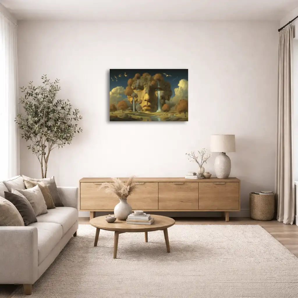 Imprimée sur toile et montée sur châssis, cette œuvre devient un véritable point focal dans votre intérieur. Dans un salon, une chambre ou un bureau, Le Visage des Cascades apporte une touche de décoration murale surréaliste, parfaite pour créer une ambiance contemplative et inspirante. Les couleurs douces et naturelles de cette toile s’associent harmonieusement à des matières comme le bois, le lin ou le rotin, autant dans un décor bohème que minimaliste.