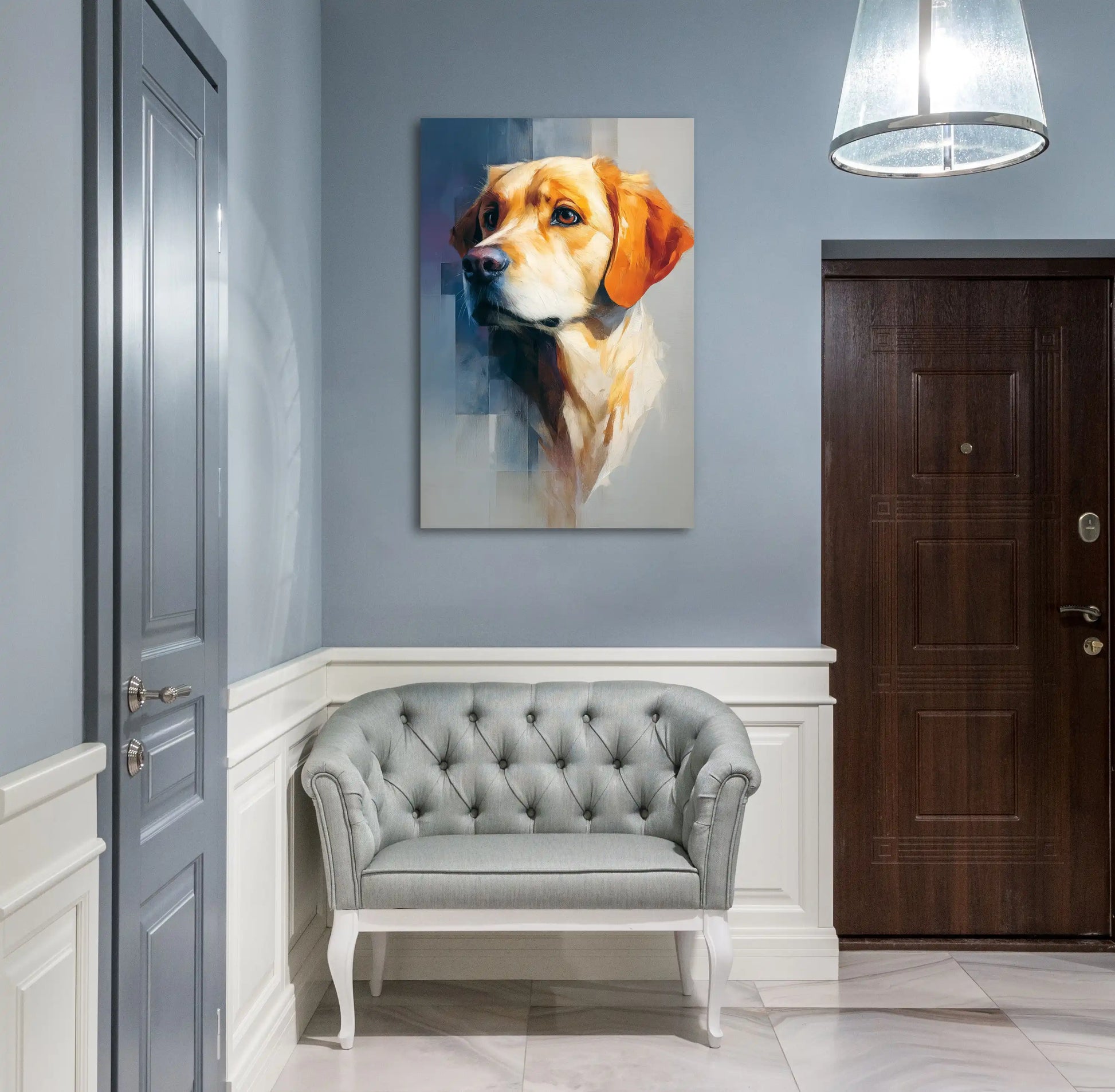 Ce tableau décoratif apporte instantanément chaleur et personnalité à votre espace. Sa composition verticale en fait une pièce idéale pour égayer un couloir, un salon ou une chambre où il créera un point focal attachant. Les tons chauds du labrador contrastant avec les bleus apaisants du fond s'intègrent harmonieusement dans tout type d'intérieur, du plus contemporain au plus classique. La toile tendue sur un châssis en bois robuste offre une présentation élégante qui met en valeur la qualité artistique de cette œuvre.