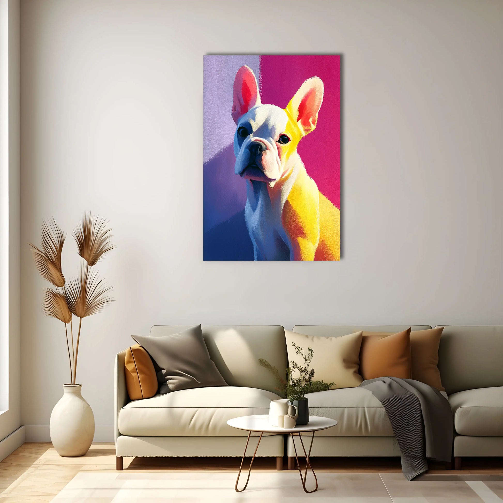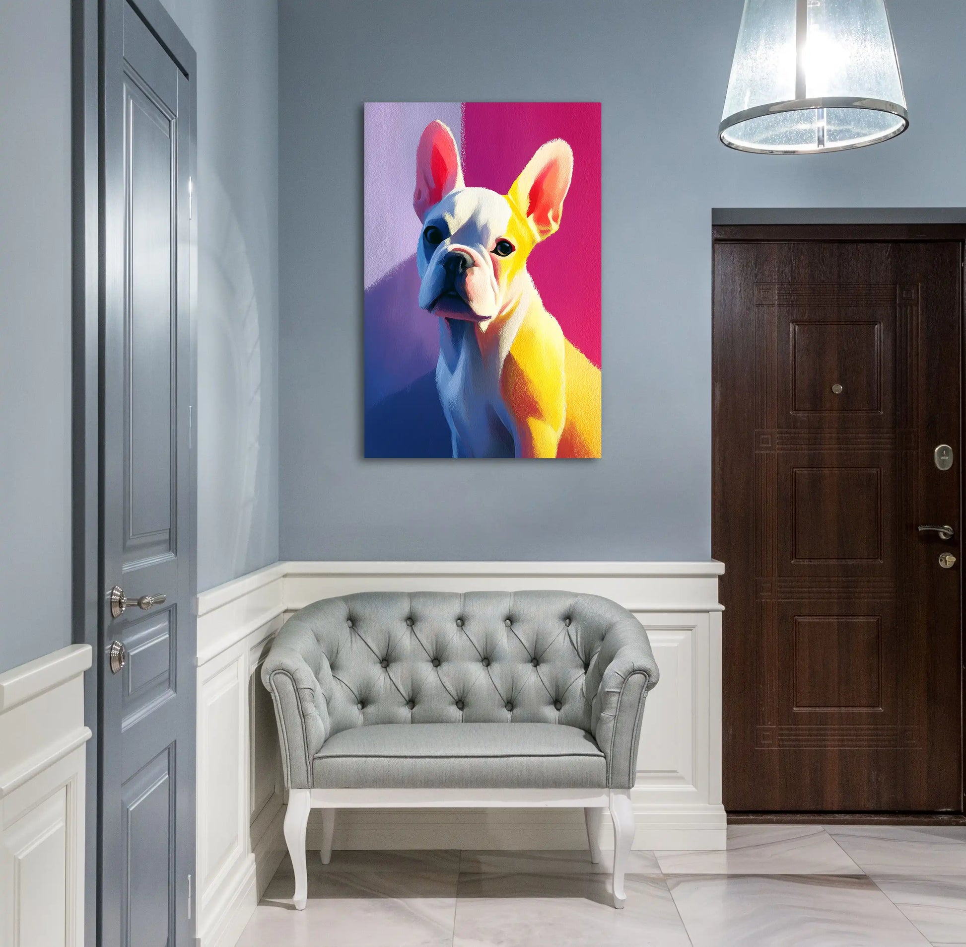Notre tableau bouledogue français "Portrait Pop Art" capture toute la personnalité attachante de cette race emblématique dans un style contemporain vibrant. Cette décoration murale présente un bouledogue blanc aux grandes oreilles expressives sur un fond bicolore audacieux - violet apaisant et rose vif énergique. Le jeu de lumière crée un effet saisissant où le côté droit du chien est baigné de reflets jaunes chaleureux tandis que le côté gauche se pare de teintes bleutées plus fraîches, offrant une toile imprimée dynamique qui apporte instantanément caractère et gaieté à votre intérieur.