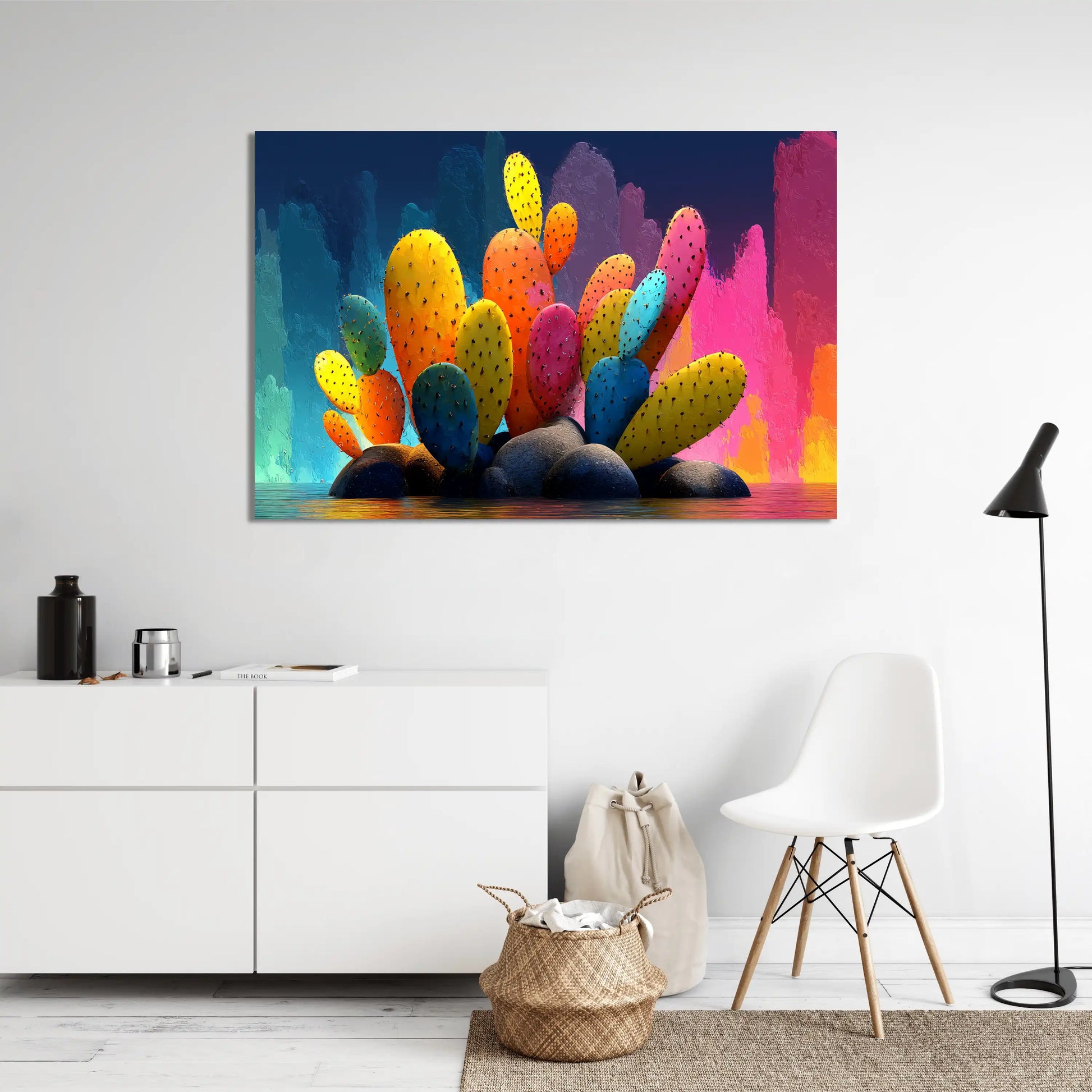 Cette toile moderne joue magistralement avec les contrastes entre les formes organiques des cactus et les couleurs artificielles qui les habillent. L'impression sur toile haute définition révèle chaque épine délicatement peinte, chaque reflet coloré sur les raquettes charnues. Le fond aquatique aux nuances dégradées crée un effet miroir fascinant, comme si cette forêt de cactus fantastiques se reflétait dans un lac magique. Cette œuvre d'art contemporaine défie nos perceptions habituelles de la nature en lui insufflant une dimension pop et ludique.