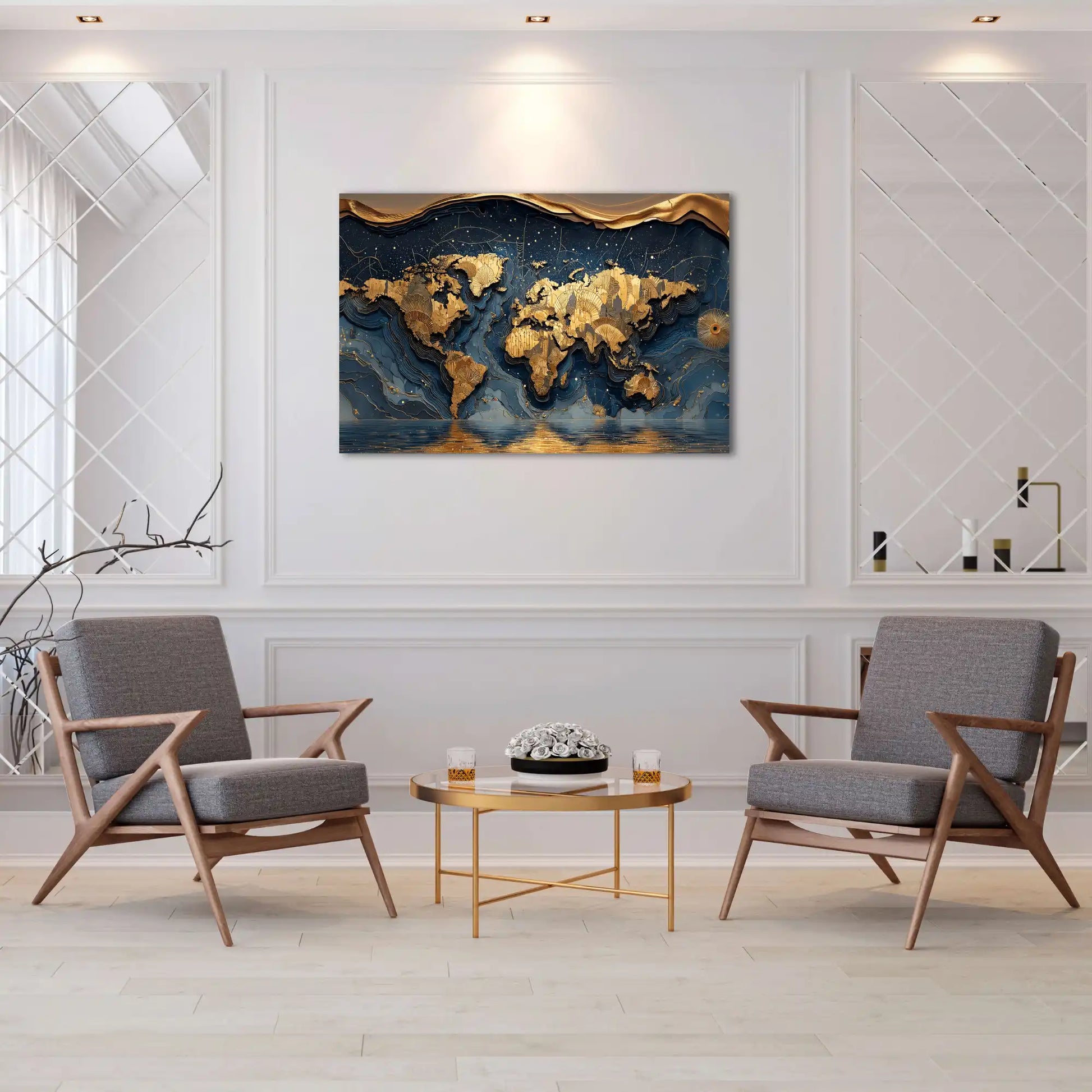 Notre tableau carte du monde doré "Atlas Céleste" transforme la géographie en œuvre d'art somptueuse où chaque continent devient un joyau sculpté dans l'or. Cette carte du monde décorative présente les terres émergées dans des tons dorés chatoyants qui contrastent majestueusement avec les océans bleu nuit parsemés d'étoiles. Les effets de relief saisissants donnent une dimension tactile à cette décoration murale d'exception, tandis que les vagues stylisées et les motifs ornementaux évoquent les cartes marines d'époque. Une impression sur toile qui célèbre la beauté de notre planète dans un style art déco contemporain.