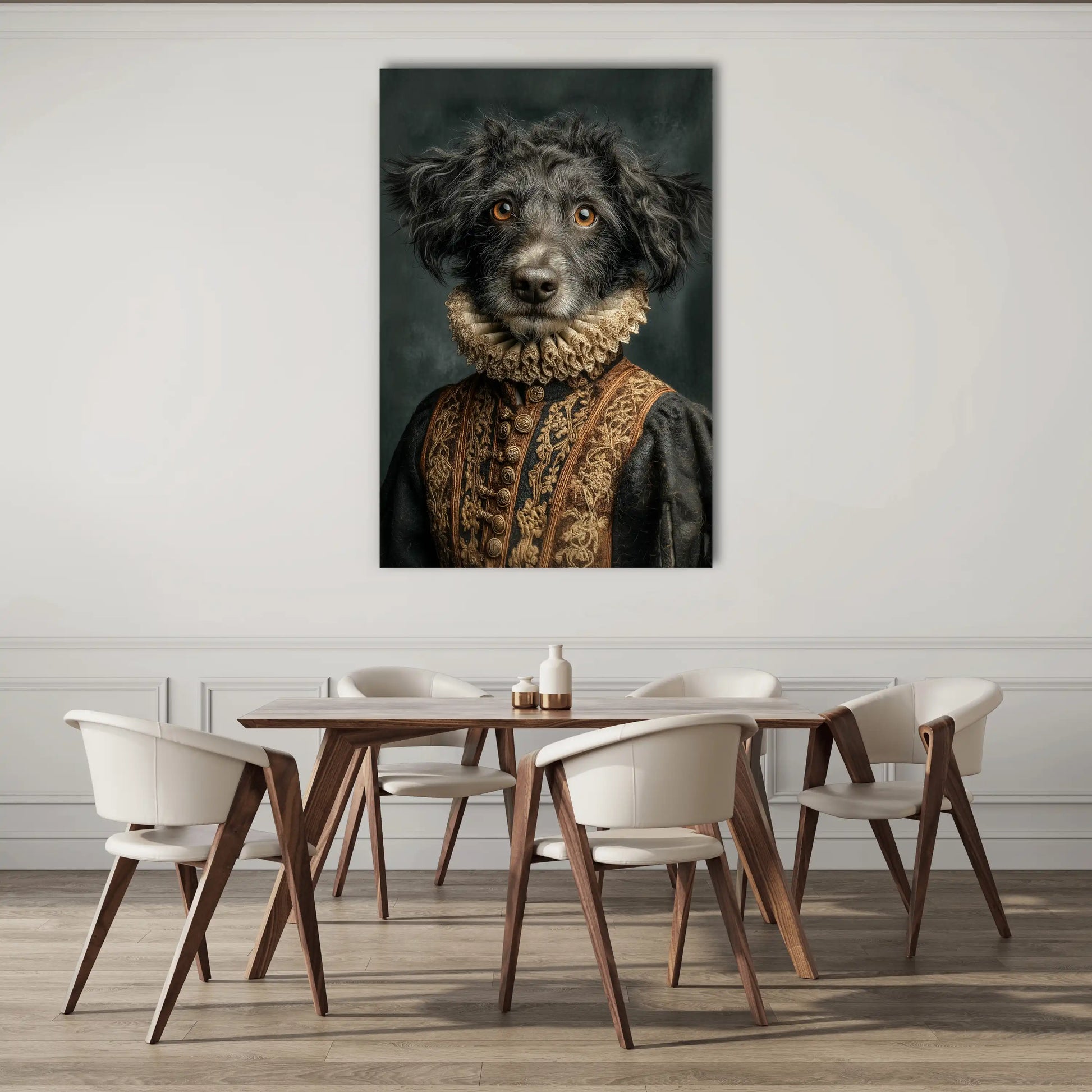 Notre tableau chien renaissance "Noble Canin" transpose votre fidèle compagnon dans l'univers fastueux de la peinture de cour du XVIe siècle. Cette décoration murale saisissante présente un adorable chien aux poils ébouriffés vêtu d'une somptueuse tenue d'aristocrate, avec pourpoint brodé d'or et collerette en dentelle finement plissée. Sur un fond vert profond évoquant les portraits des grands maîtres, le regard expressif et intelligent de ce canin d'élite crée une connexion immédiate avec l'observateur, transformant cette toile imprimée en une pièce à la fois émouvante et empreinte d'un humour sophistiqué.