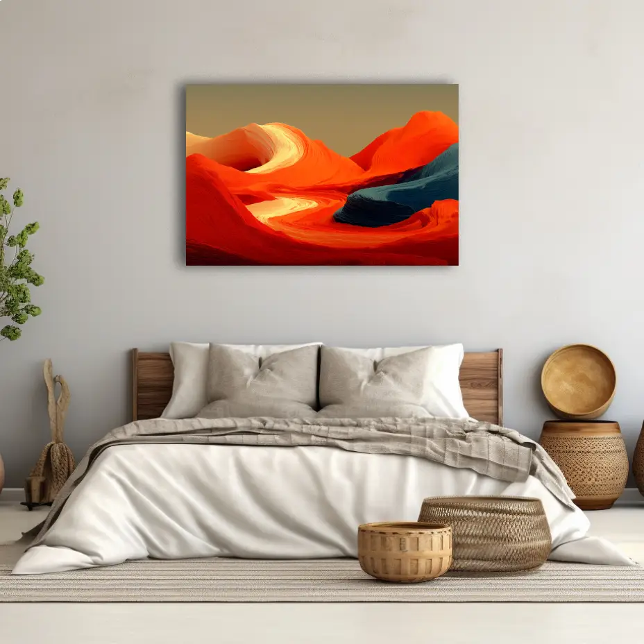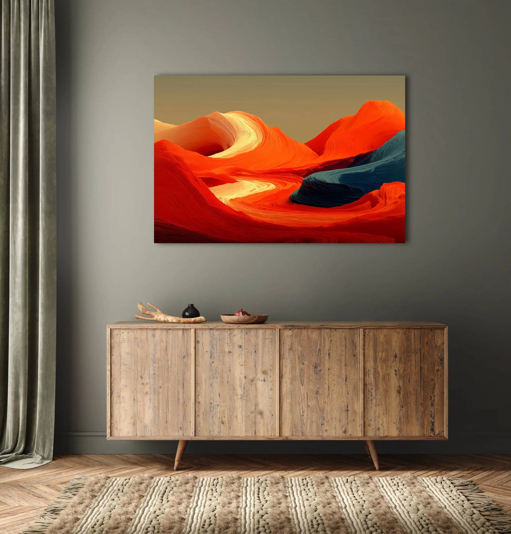 Sur cette toile panoramique, les Collines Toscanes Abstraites déroulent des crêtes incendiaires, fusion d’orange brûlé, de vermillon et d’argile rouge. Un ruban crème serpente dans la vallée, telle une rivière de lumière, tandis qu’une crête bleu ardoise surgit en contrepoint, apportant une fraîcheur inattendue. L’horizon olive, légèrement voilé, étire la perspective et confère à l’ensemble une douceur vintage, évoquant les affiches de voyage d’autrefois.