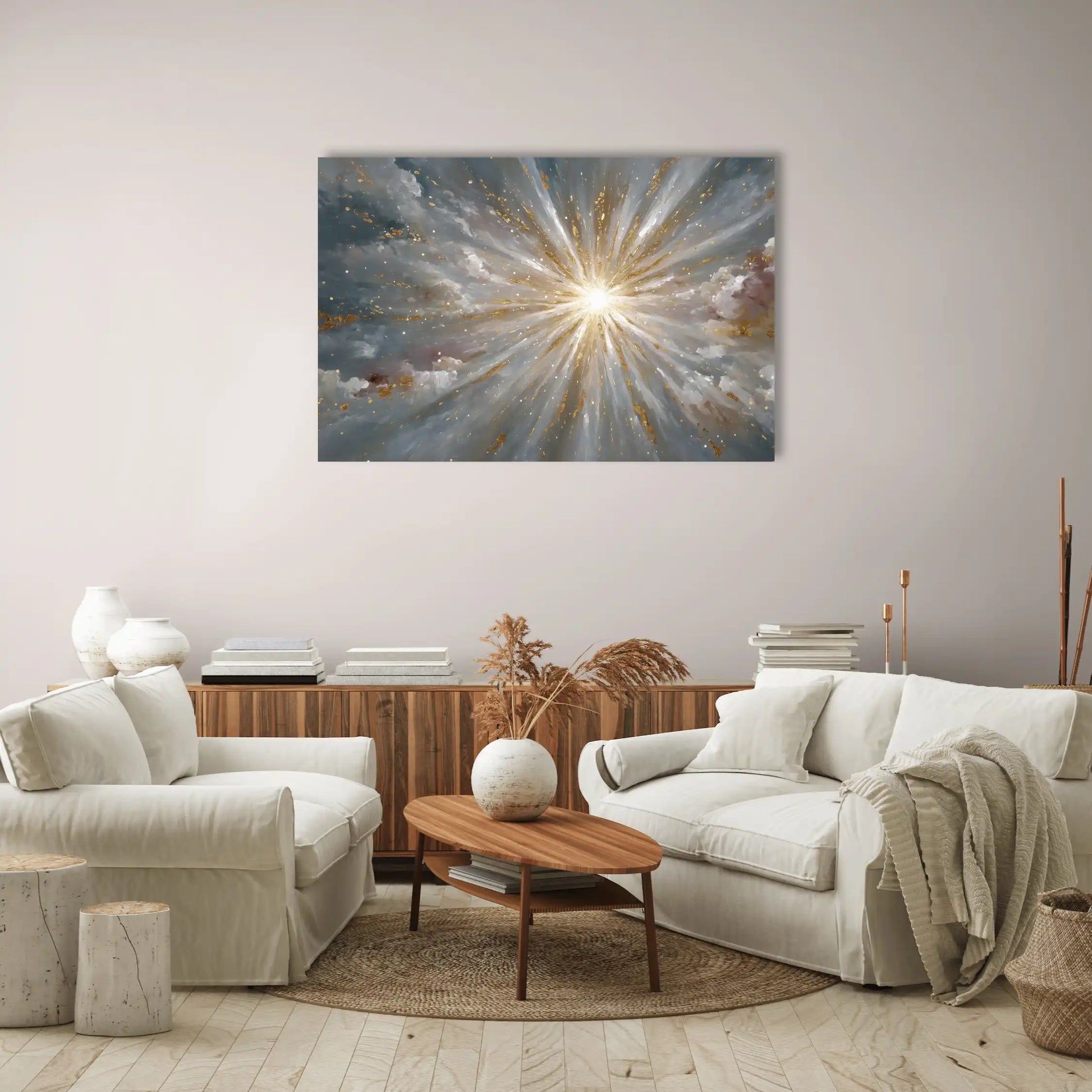 Plus qu'une simple décoration murale, ce tableau est une invitation à la contemplation et à l'élévation. La puissance tranquille qui émane de cette explosion de lumière évoque un moment d'épiphanie, un rappel visuel de ces instants où la clarté traverse les nuages de nos vies. En grand format, cette œuvre révèle toute sa splendeur et ses nuances subtiles : variations délicates dans les tons nuageux, éclats dorés qui semblent danser dans la lumière, rayonnement qui paraît s'intensifier selon l'angle de vue. Un tableau lumineux qui ne se contente pas d'habiller un mur, mais qui transforme véritablement l'énergie et l'ambiance de votre espace, offrant chaque jour une nouvelle perspective sur la beauté de la lumière et l'équilibre parfait entre douceur et puissance.