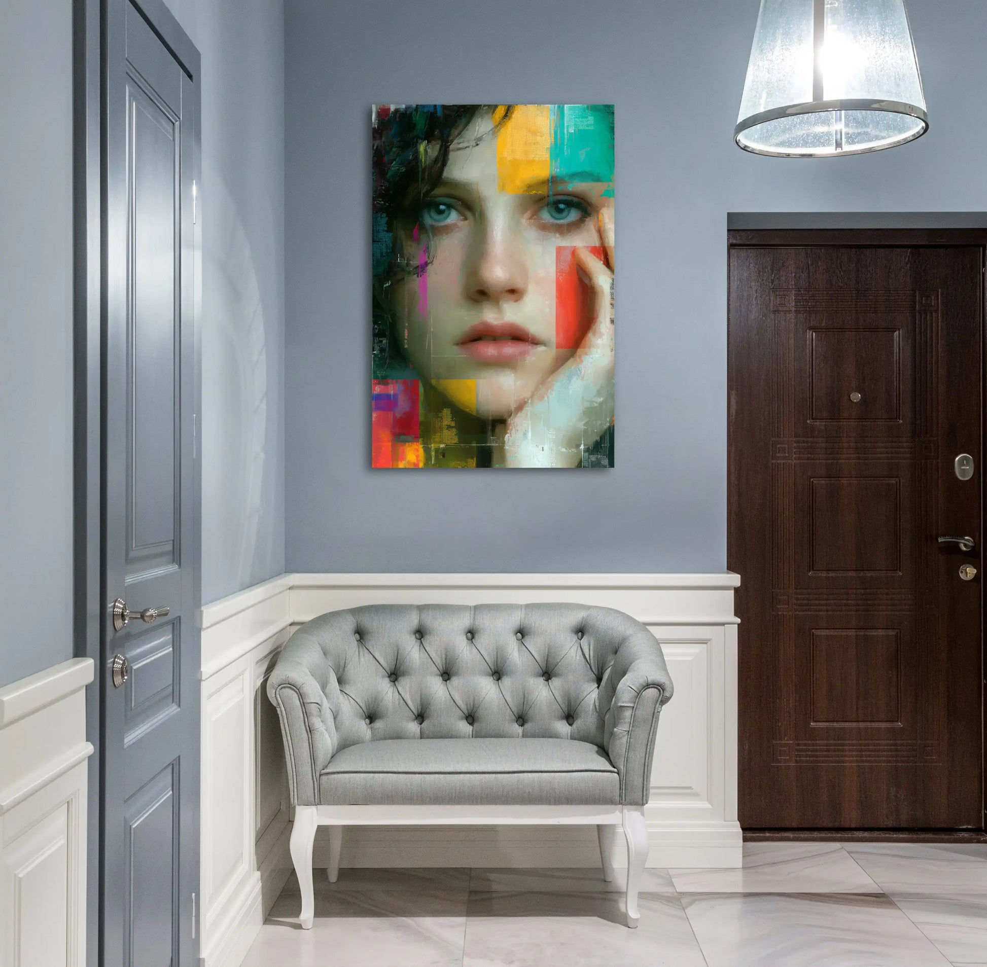 Ce tableau mural va bien au-delà de la simple représentation. Il explore la fragmentation de l'identité dans notre monde contemporain, où l'être se révèle par fragments. La composition verticale met en valeur l'expressivité du regard et des lèvres, tandis que les blocs de couleur semblent dévoiler et masquer simultanément différentes facettes de la personnalité. Un art contemporain qui transforme votre intérieur en un espace de réflexion et d'émotion.