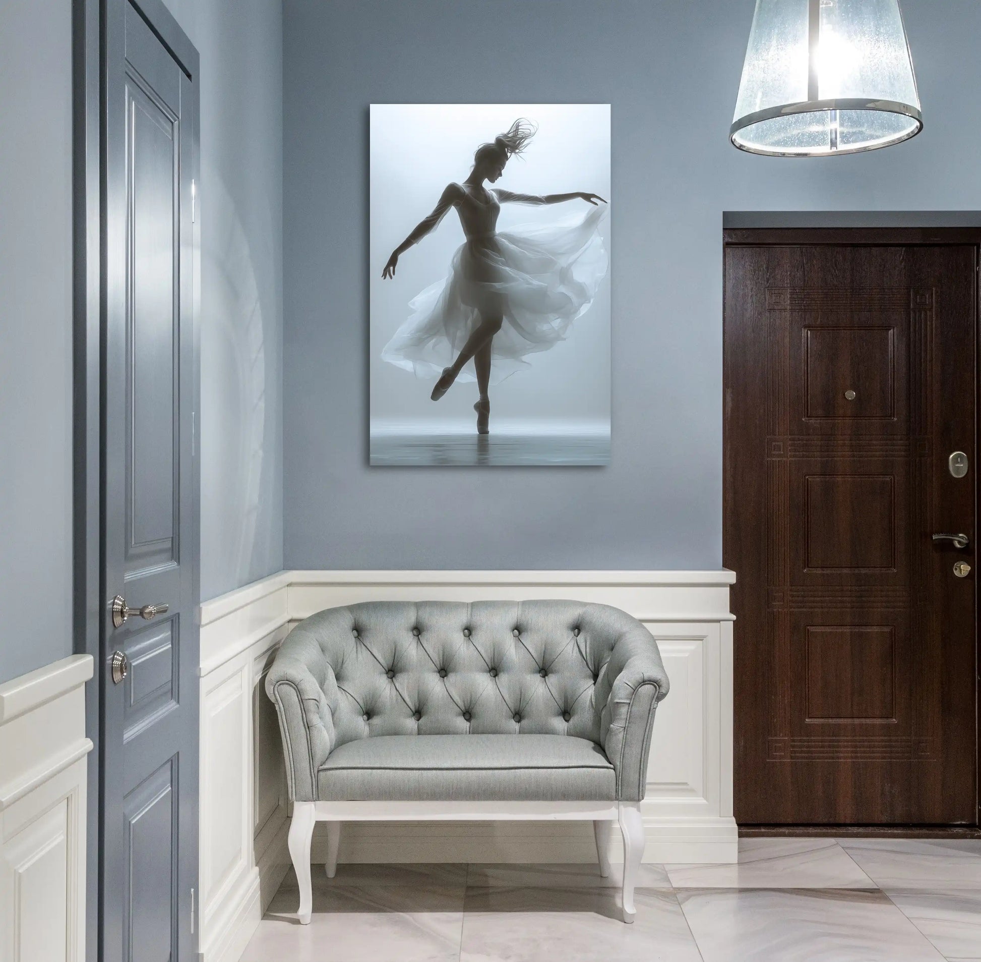 Cette toile imprimée se distingue par son traitement photographique minimaliste où les tons de blancs et de gris perlés se fondent avec subtilité. La technique d'éclairage dramatique révèle chaque courbe et mouvement de la danse classique, tandis que l'arrière-plan brumeux accentue l'impression de légèreté. Le tutu vaporeux de la ballerine semble flotter dans l'espace, créant une tension visuelle fascinante qui fait de ce tableau décoratif une véritable célébration du mouvement dans l'espace.