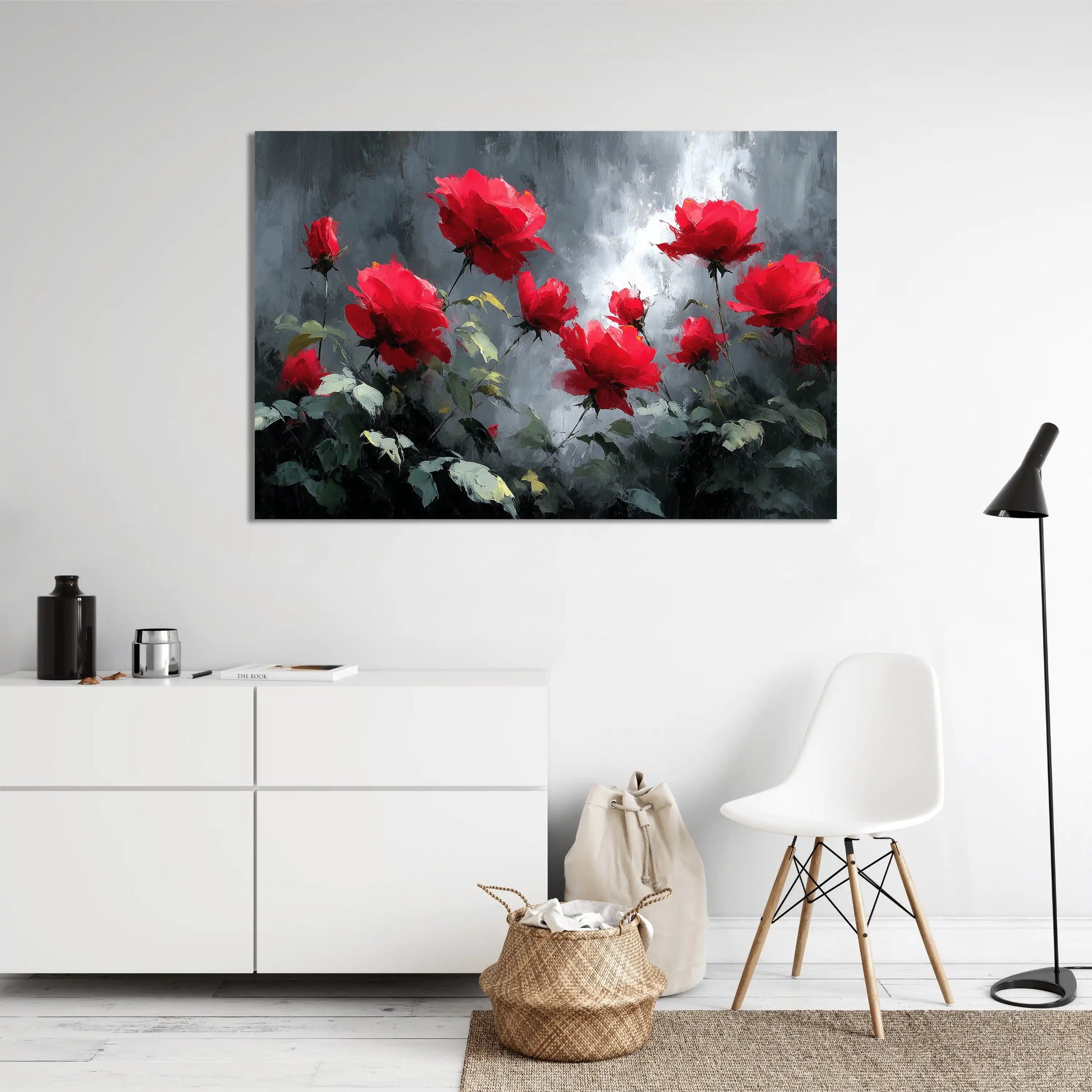 Cette toile imprimée maîtrise l'art du contraste dramatique en opposant la vivacité éclatante des fleurs rouges à la sobriété sophistiquée de l'arrière-plan nuageux. Chaque rose semble illuminée de l'intérieur, créant un effet de lumière naturelle qui donne vie à cette composition florale. L'impression sur toile haute définition révèle la richesse des textures et la profondeur des couleurs qui caractérisent cette technique impressionniste moderne. Les feuillages aux tons vert olive et les tiges délicates complètent harmonieusement cette décoration murale d'exception.