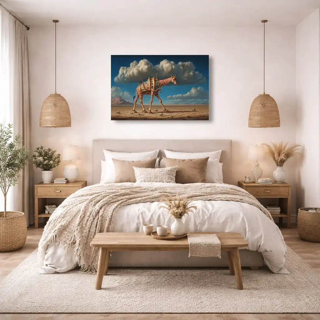 Imprimée sur toile et montée sur châssis, cette œuvre devient le point focal parfait d’un salon moderne, d’un bureau créatif ou d’un studio d’artiste. La palette de bleus profonds, de beiges sableux et de dorés subtils permet à cette toile girafe surréaliste de s’intégrer aussi bien dans un intérieur industriel que bohème ou minimaliste. Elle apporte une décoration murale onirique qui attire le regard et stimule l’imagination au quotidien.