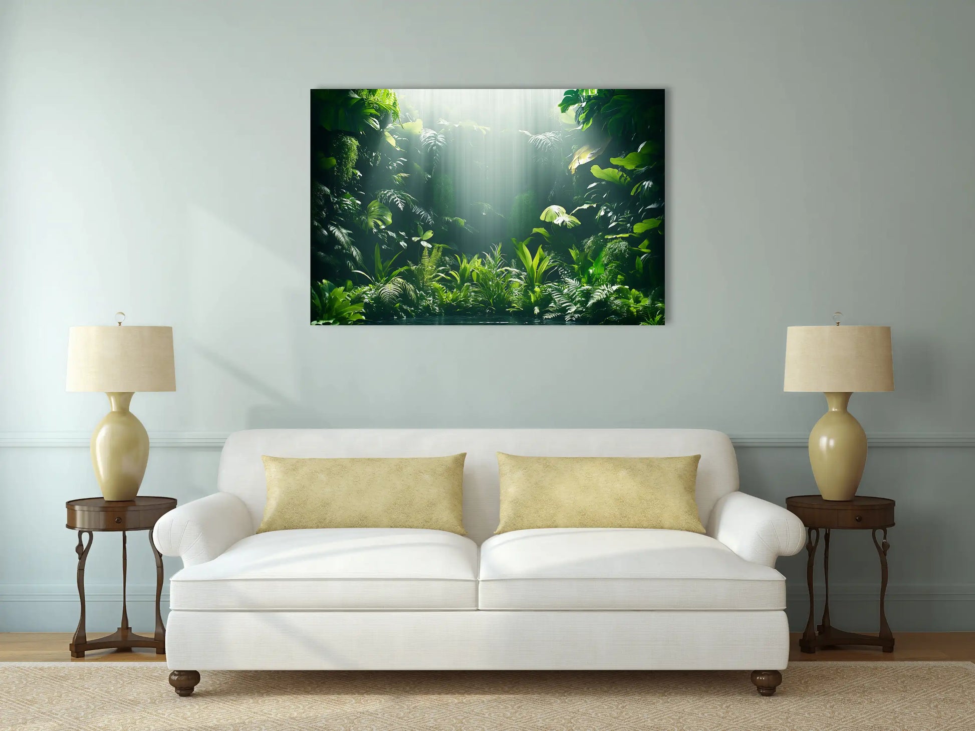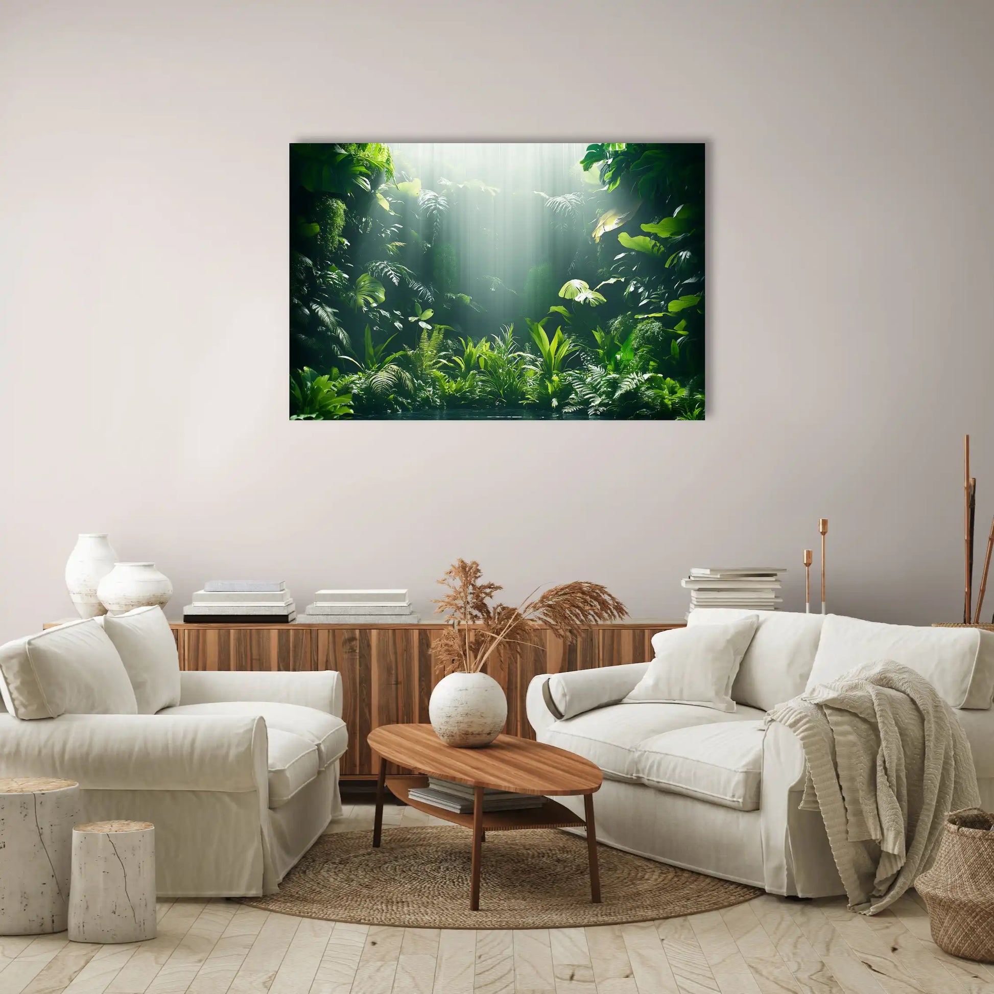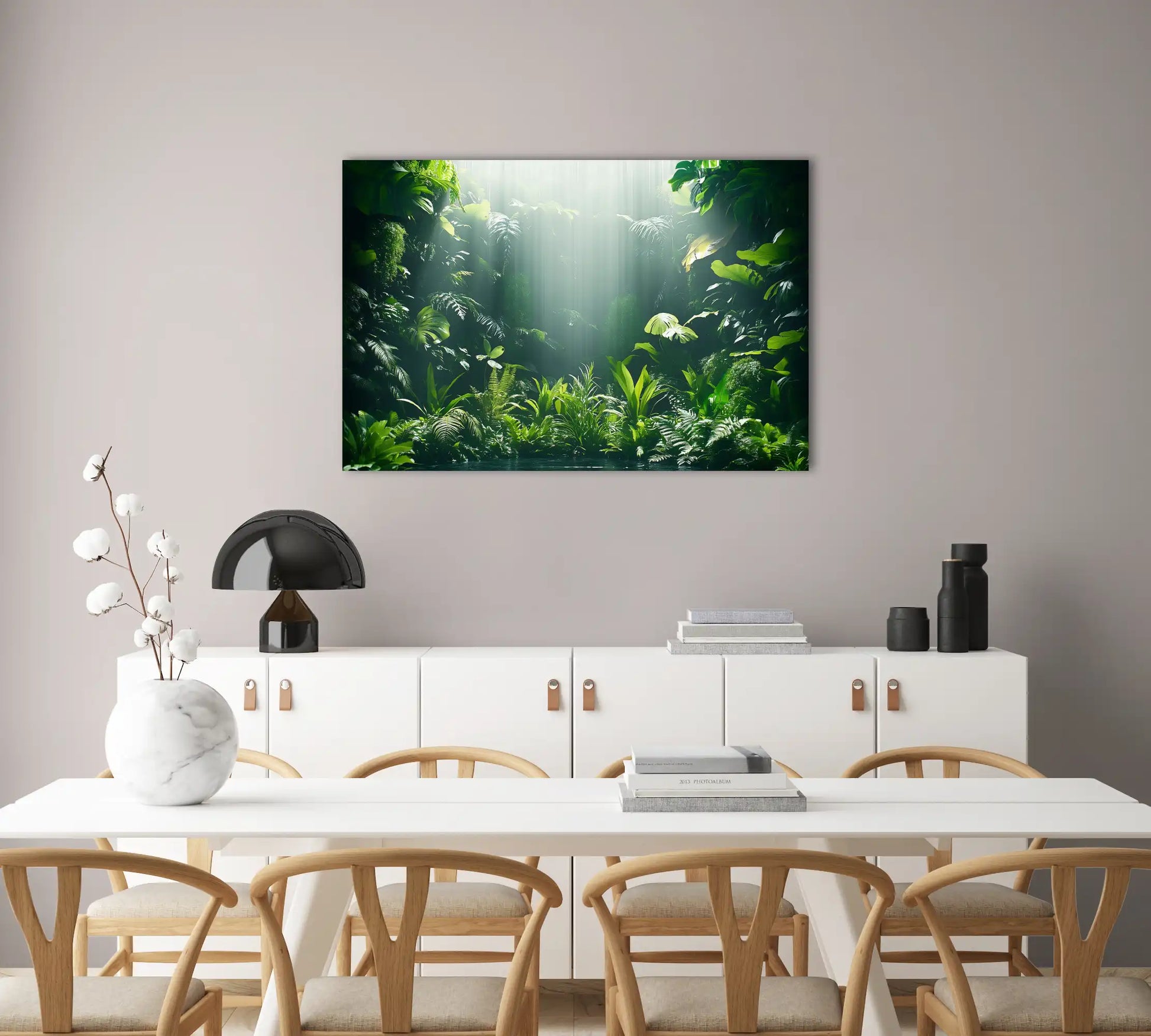 Cette impression sur toile se distingue par sa richesse botanique exceptionnelle. Chaque plante est rendue avec une précision qui permet de distinguer la texture soyeuse des feuilles de philodendron, la délicatesse des fougères et la robustesse des palmiers. La brume légère qui flotte dans les rayons lumineux crée une atmosphère mystique, presque sacrée, donnant à ce tableau décoratif une profondeur fascinante. La technique photographique sublime transforme cette scène naturelle en une œuvre d'art qui célèbre la vie dans toute sa splendeur végétale.