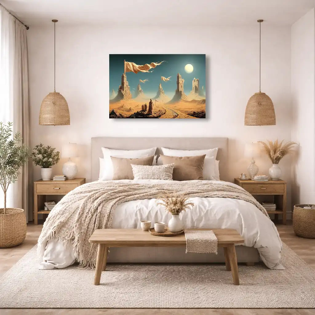 Imprimée sur toile et montée sur châssis, cette œuvre transforme votre mur en fenêtre ouverte sur un univers onirique. Dans un salon moderne, un bureau de travail ou une bibliothèque, Les Tours du Désert devient un point focal fort, parfait pour une décoration murale surréaliste empreinte d’évasion. Sa palette de bleus profonds, de beiges sablés et d’ocre chaud s’accorde aussi bien avec une ambiance minimaliste qu’avec une décoration plus boho ou industrielle.