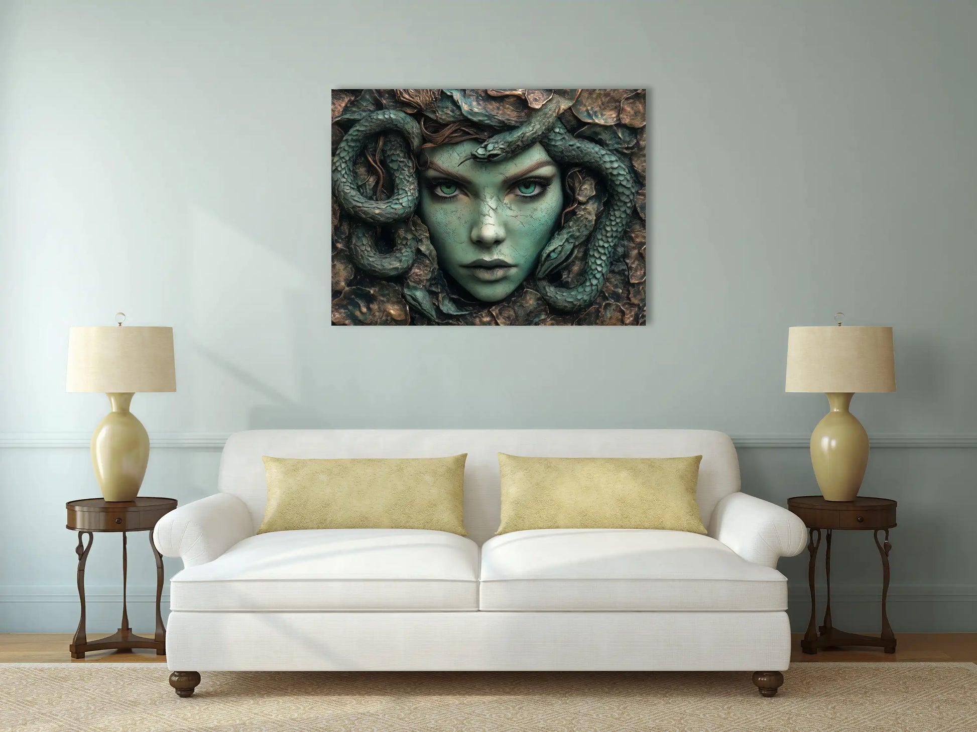 Ce tableau décoratif se distingue par sa richesse chromatique où dominent les teintes de patine verte, de bronze antique et de turquoise profond. La technique picturale exceptionnelle, fidèlement reproduite par notre impression haute définition, crée un effet presque sculptural où chaque écaille de serpent, chaque fissure du visage et chaque reflet métallique est rendu avec une précision saisissante. Le jeu subtil entre les textures rugueuses du fond et la douceur inquiétante du visage crée une tension visuelle qui captive le regard et invite à la contemplation.