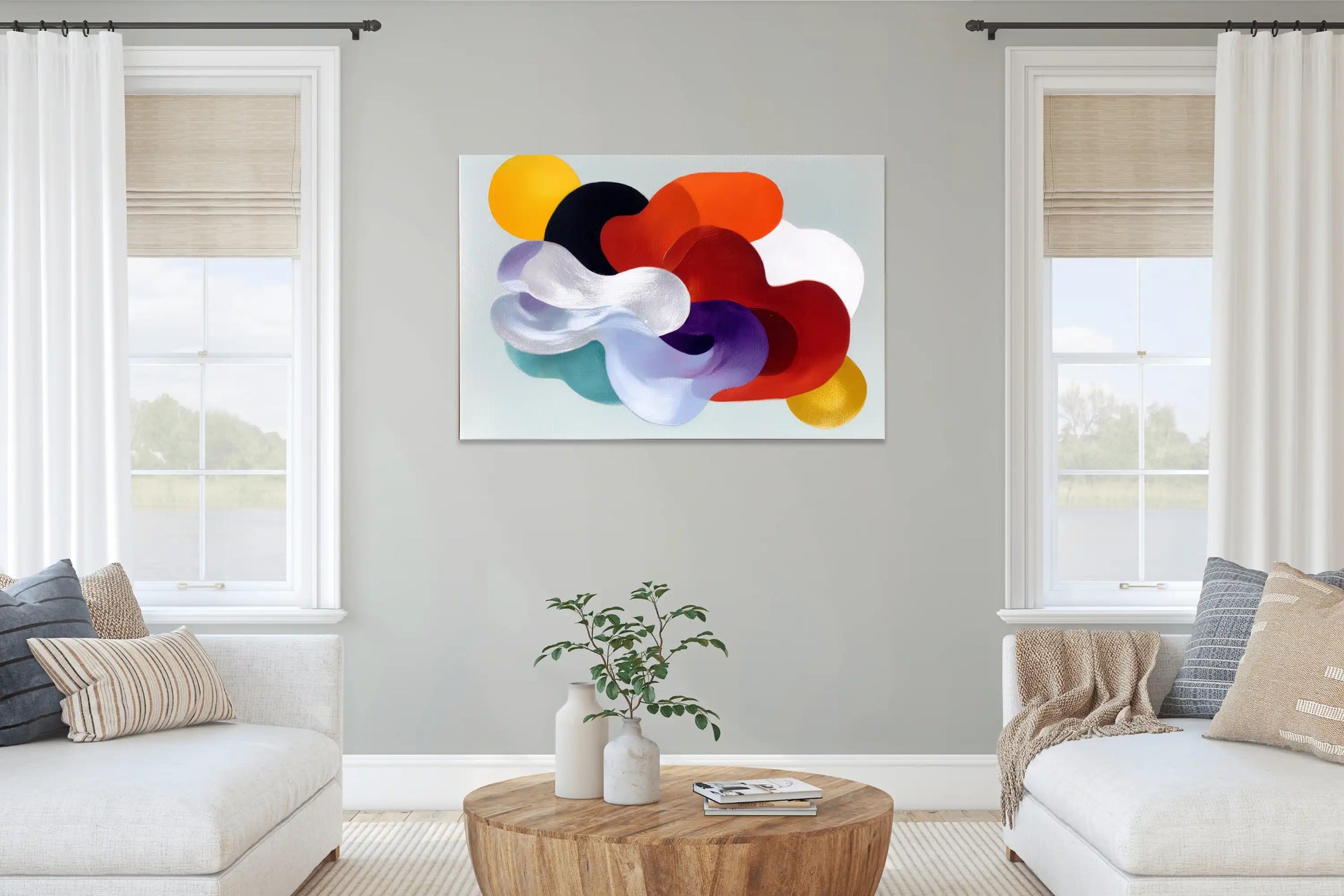 Un ensemble de formes souples se noue au centre comme un nuage pastel traversé d’éclats carmin, d’orange et de violets profonds. Deux disques jaunes dialoguent avec un cercle noir, tandis qu’un ruban nacré glisse sur un fond menthe très doux. Le format horizontal renforce l’effet d’ondulation et installe un rythme apaisant. Cette toile contemporaine conjugue sensualité des courbes et esprit design nordique pour une présence graphique et lumineuse.