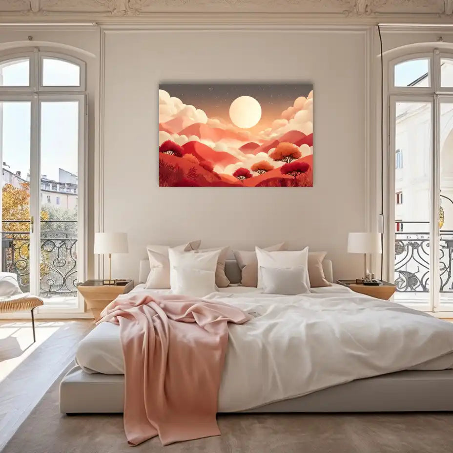 Notre tableau pour chambre cocooning "Aurore Terracotta" transforme votre espace intime en havre de paix avec son paysage stylisé aux couleurs tendres et réconfortantes. Cette décoration chambre présente un horizon vallonné baigné dans les tons rose corail, orange pêche et rouge brique qui évoquent la douceur d'un lever de soleil matinal. Les arbres aux silhouettes délicates et la lune nacrée qui domine cette composition créent une atmosphère onirique parfaite pour favoriser la détente et le repos. Cette peinture cocooning invite instantanément à la sérénité et au bien-être.