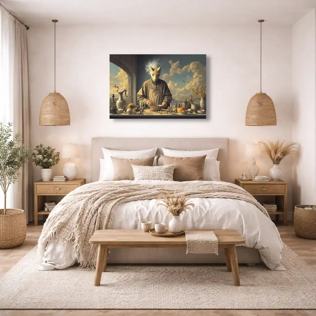 Au centre de ce Tableau surréaliste Alchimiste au Masque de Chat, une silhouette mystérieuse se tient derrière un long établi, concentrée sur un bol comme sur un rituel secret. Son visage disparaît derrière un masque de chat ivoire d’où semble jaillir une aura lumineuse, soulignant le caractère ésotérique de la scène. Autour de lui, flacons, bougies, théières, citrouilles et objets précieux composent une nature morte foisonnante, tandis qu’un ciel de nuages dorés s’ouvre en arrière-plan, traversé par quelques oiseaux.