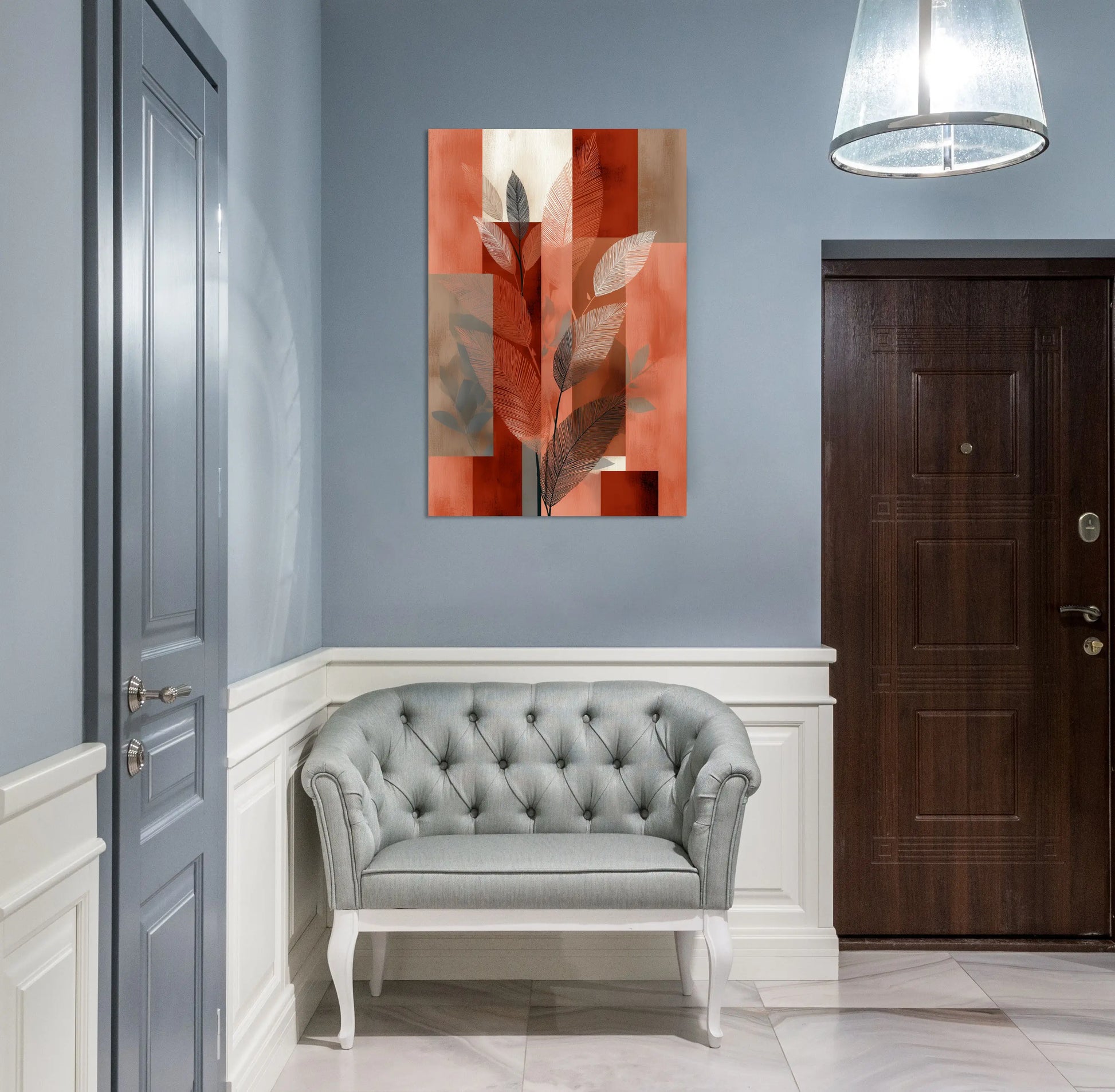 D’un tracé élancé, de délicates feuilles se dressent sur une mosaïque de rectangles terracotta, beige sable et argile brune. Les nervures fuselées se détachent en filigrane, mêlant la précision d’un art graphique à la douceur d’une palette naturelle. Cette toile verticale diffuse instantanément l’âme chaleureuse du style boho chic, invitant la pièce à respirer une sérénité artisanale.