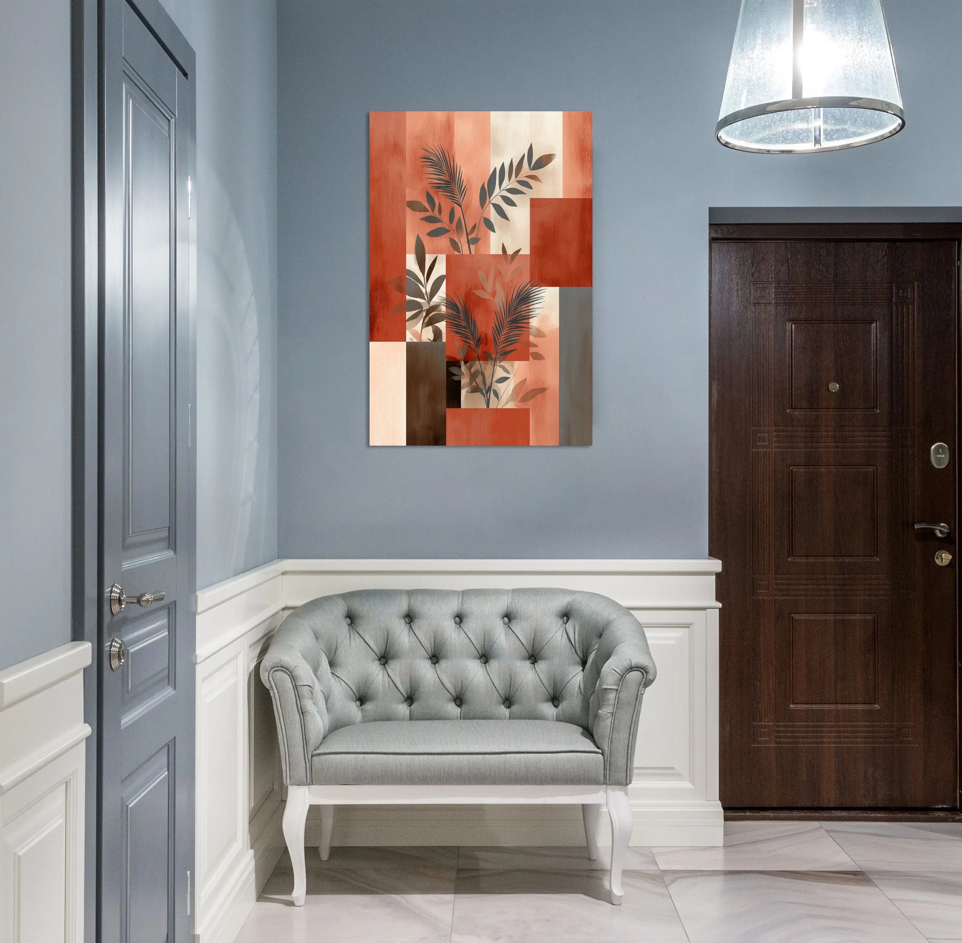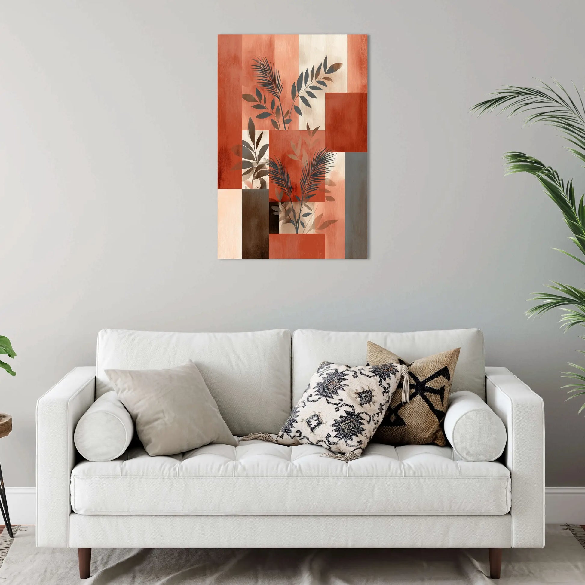 Sur cette toile verticale, des tiges d’eucalyptus et des frondes de palmier se dessinent en clair-obscur sur un damier d’ocres terracotta, de sable vanillé et de taupe fumé. Les feuilles, tantôt aquarellées, tantôt ciselées à l’encre anthracite, semblent se presser contre une vitre chauffée par le midi. Ainsi naît un herbier graphique où la nature urbaine s’ancre dans une architecture géométrique apaisante.