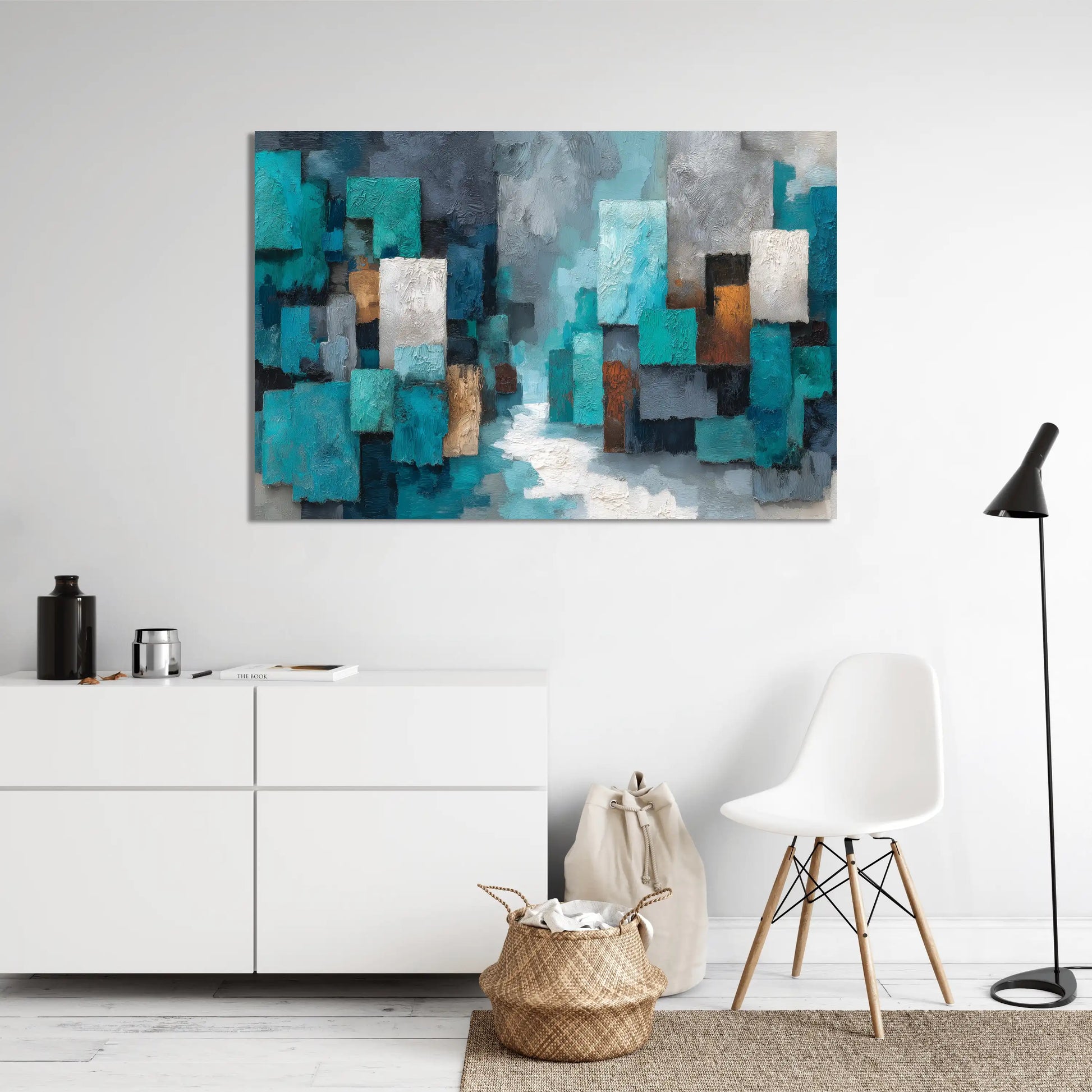 Les superpositions géométriques invitent à la contemplation, évoquant tour à tour des falaises de glace, des îlots urbains ou des fragments océaniques. Chaque regard découvre un détail nouveau : une trace de couteau, une impalpable nuance d’aqua, un éclat ivoire qui illumine l’ensemble. Ce tableau abstrait devient ainsi le miroir de votre imagination, se réinventant au gré de la lumière naturelle et des humeurs.