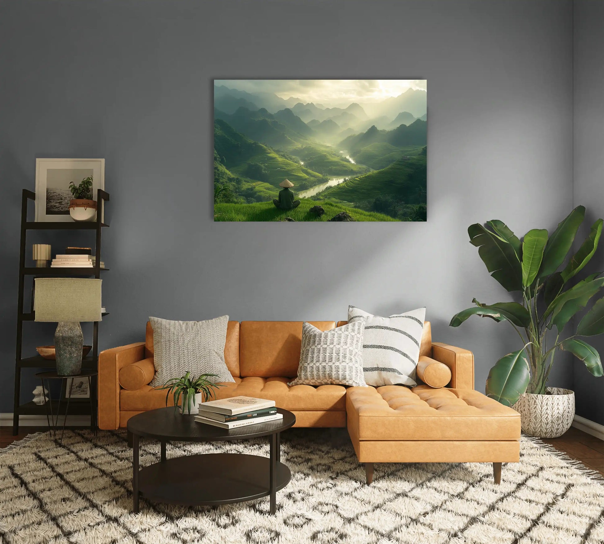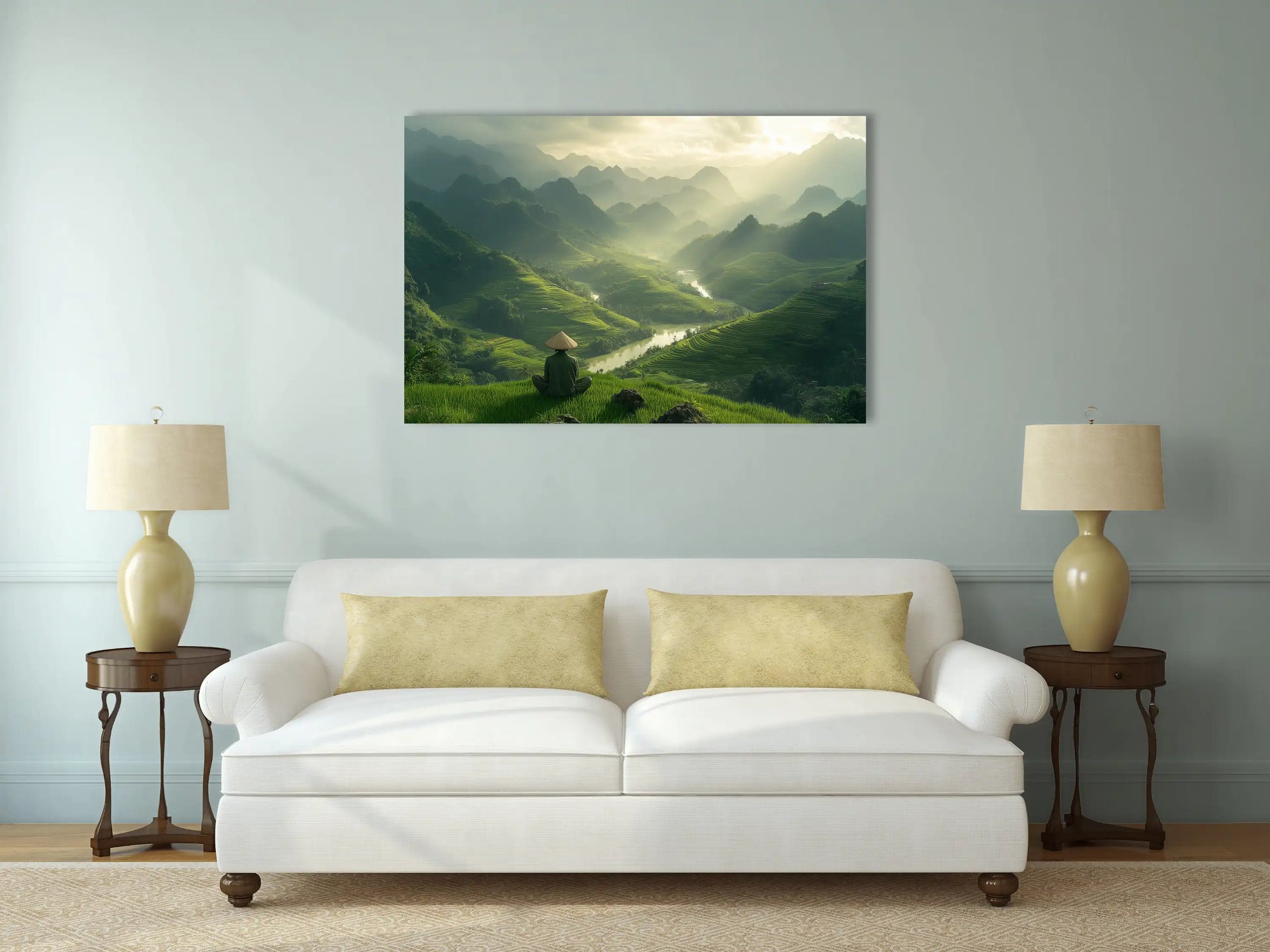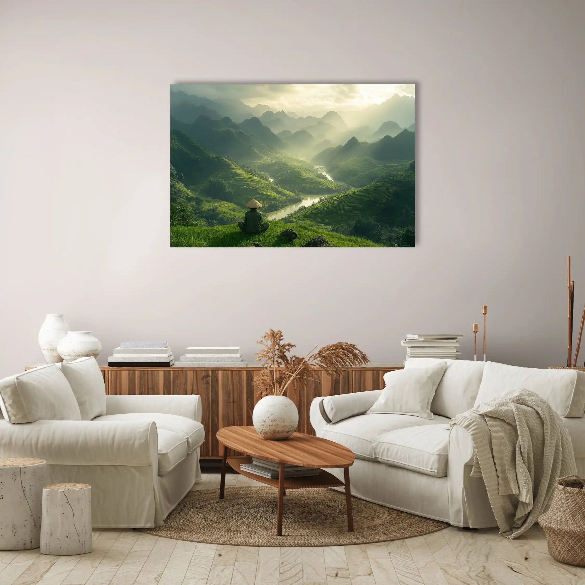Notre tableau Vietnam "Méditation Ancestrale" capture l'essence spirituelle des paysages asiatiques dans une composition d'une sérénité absolue. Cette toile imprimée dévoile un moine solitaire, coiffé du chapeau conique traditionnel, méditant face à l'immensité des rizières en terrasse qui s'étendent à perte de vue. Les rayons du soleil traversent délicatement la brume matinale, créant une décoration murale où chaque rayon de lumière semble suspendu entre ciel et terre, invitation silencieuse à la contemplation.