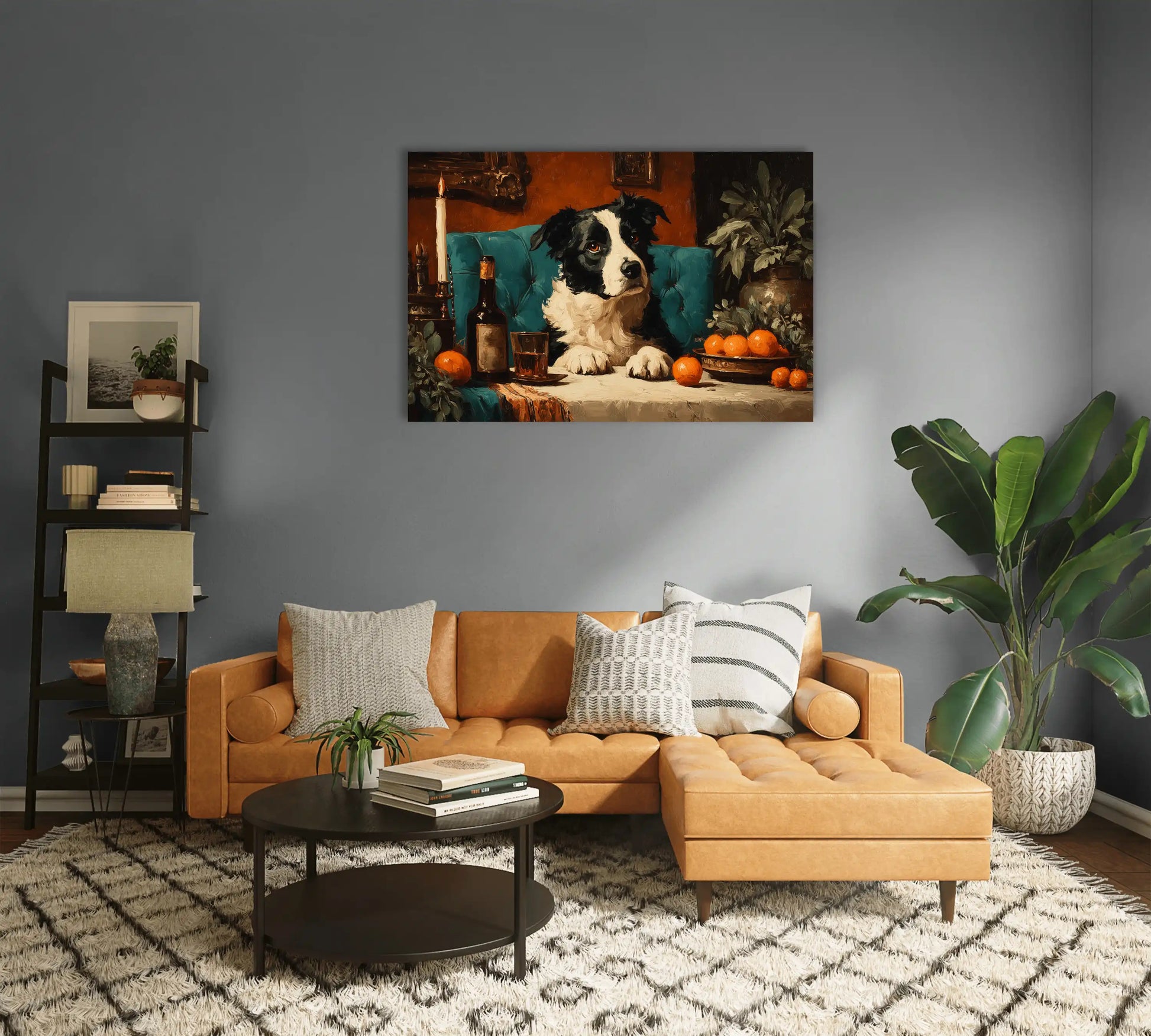 Cette toile imprimée en haute définition restitue fidèlement chaque coup de pinceau de l'œuvre originale, capturant les textures riches de la peinture à l'huile qui donnent tant de profondeur à ce portrait. La palette chromatique soigneusement orchestrée - des oranges vibrantes aux bleu-vert profonds, en passant par les tons chauds de brun et d'ocre - crée une harmonie visuelle typique des natures mortes classiques. L'effet de clair-obscur, inspiré des techniques des grands maîtres, met en valeur le regard expressif du border collie et la texture soyeuse de son pelage, créant un tableau décoratif à la fois nostalgique et intemporel.