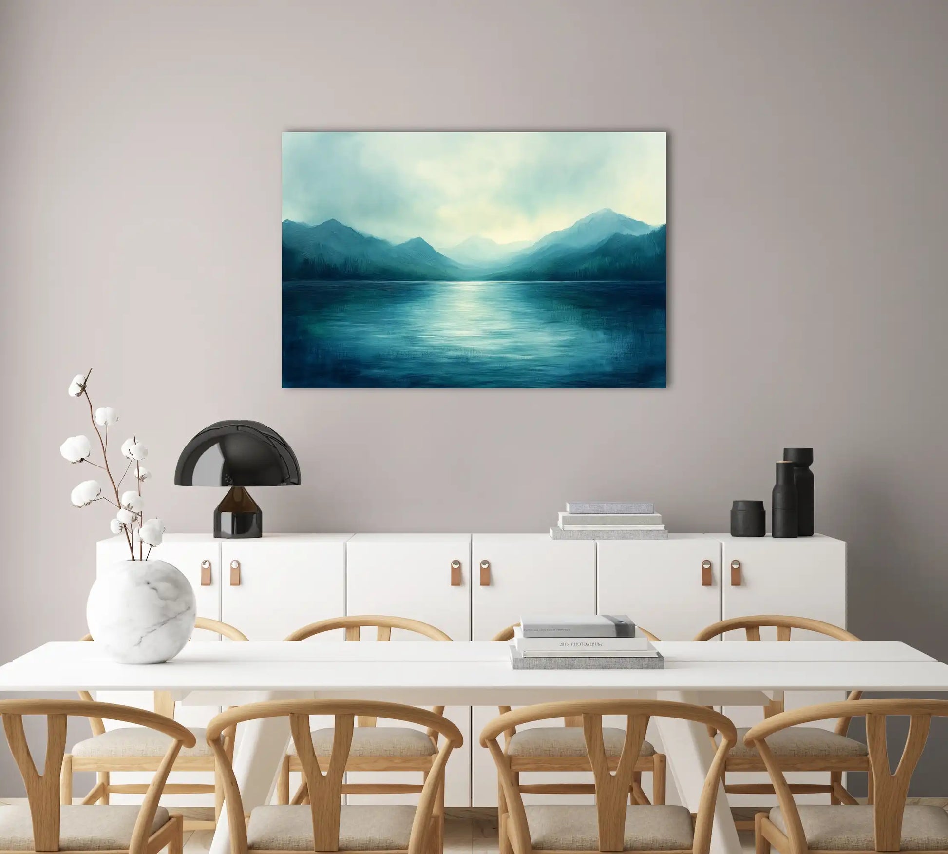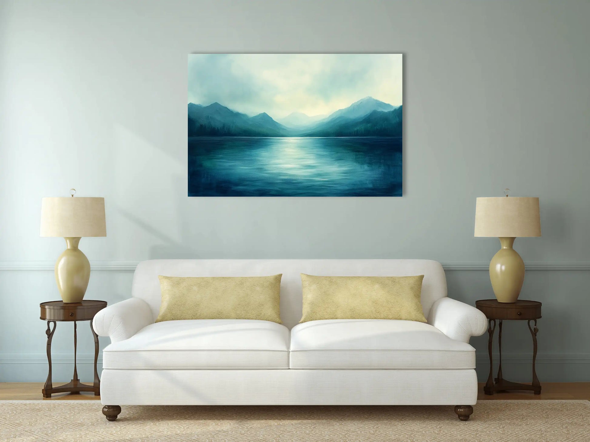 Notre tableau zen Sérénité Bleutée vous transporte dans un paysage de montagne envoûtant où la brume légère enveloppe les sommets majestueux. Cette toile imprimée capture l'instant magique où la lumière douce filtre à travers les nuages pour se refléter sur les eaux paisibles du lac, créant une décoration murale d'une tranquillité absolue. L'horizon lointain et les silhouettes montagneuses invitent à la contemplation et au voyage intérieur.