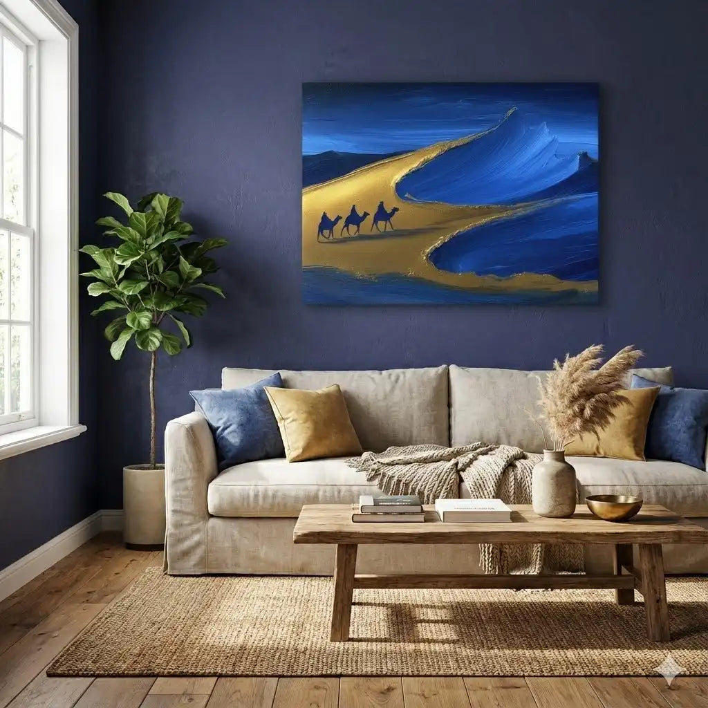 Les aplats vibrants mêlent bleus nocturnes et reflets dorés, avec une texture qui rappelle la crête des dunes. La composition en S guide le regard vers l’infini et s’accorde parfaitement à un intérieur ethnique chic, bohème ou design. Bois clair, lin naturel, terracotta : tout dialogue avec cette évocation d’art africain au format paysage.