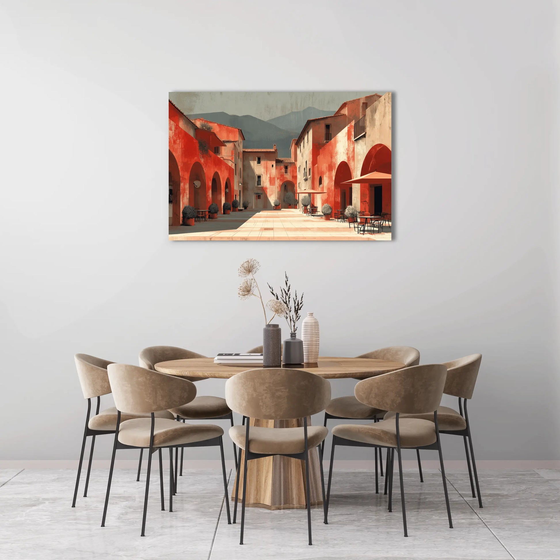 Dans Toile Place Méditerranéenne Arcades Terracotta, les façades rouge corail s’ouvrent en larges arcades ombragées, formant un écrin chaleureux où le temps semble suspendu. Le dallage clair reflète la clarté du sud, tandis que, çà et là, des tables de bistrot et des pots d’arbustes globuleux attendent les conversations lentes d’un après-midi estival. Au fond, la rumeur bleutée des montagnes apaise le regard et ancre la scène dans une quiétude presque cinématographique.